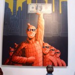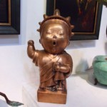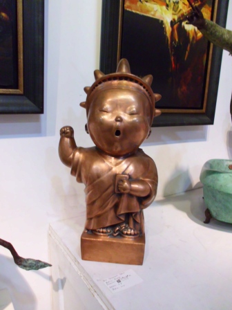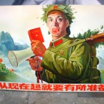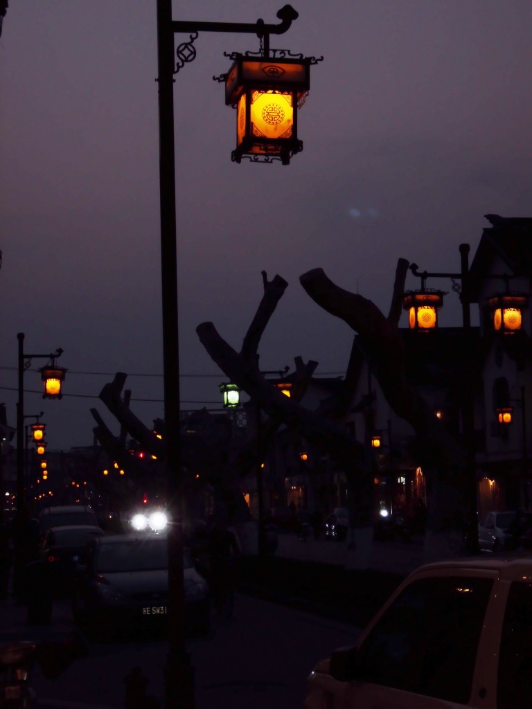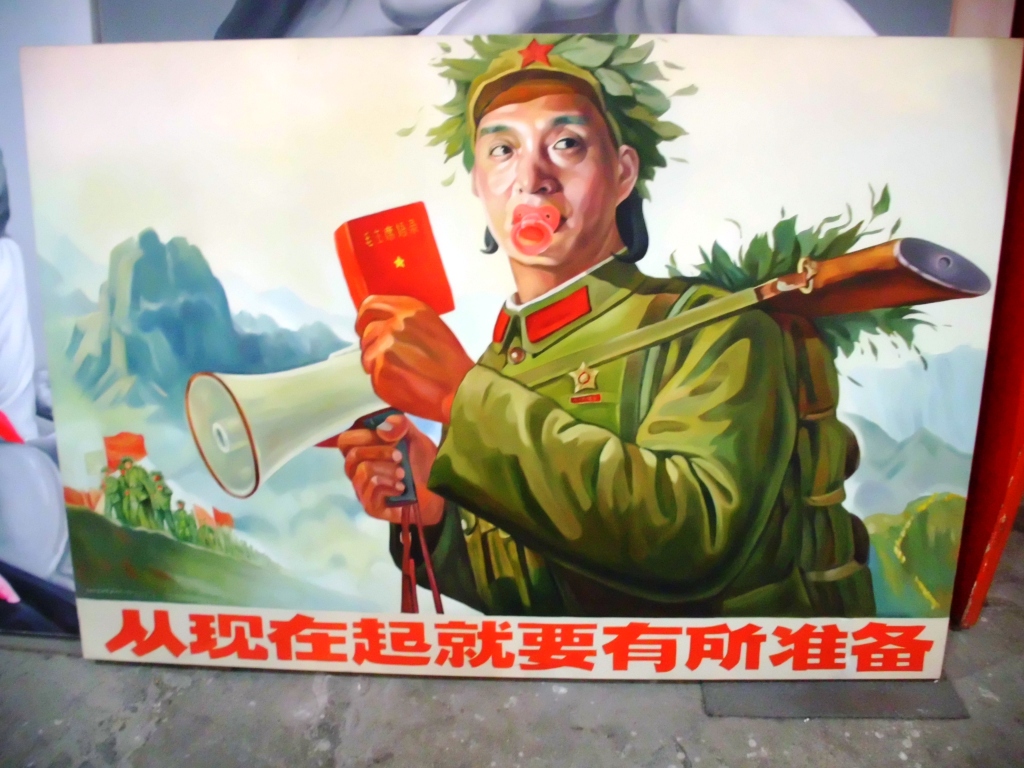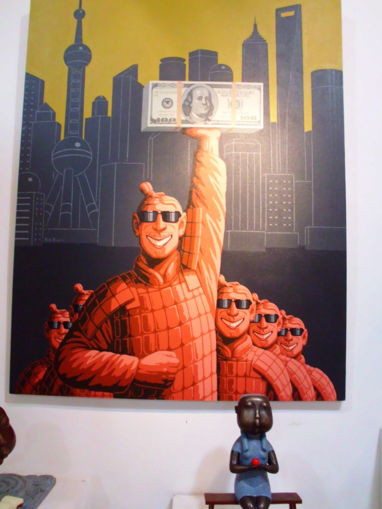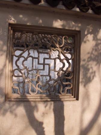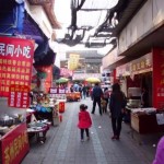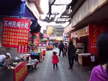 Auch ein goldener Buddha war zu bewundern (Obacht, niemals fotographieren, das ziemt sich nicht!) und immer wieder markant für Johanna und mich: das Hakenkreuz auf der Brust des im Lotussitz trohnenden Mannes. Eigentlich ist es nicht das Hakenkreuz, sondern die Swastika – das Kreuz zeigt also nach links und nicht nach rechts. Es steht in China für Glück und wurde später auch bei den Germanen zur Anbetung der Sonne genutzt. Hitler hat es dann für seine Zwecke missbraucht, umgedreht und „Reinheit“ hineingedeutet. Wenn mir das Kreuz hier immer begegnet, muss ich an den Film von Mo Asumang, den wir auf dem Vorbereitungseminar gesehen hatten: „Roots Germania“, eine interessante Dokumentation einer Halbafrikanerin auf der Suche nach ihren deutschen Wurzeln. Denn wenn wir uns mit den Germanern mal näher auseinander setzen würden, kämen wir zu überraschenden Gemeinsamkeiten mit fernöstlichen oder afrikansischen Naturglauben. Als wir die Tempelanlage verließen, sahen wir auch den Grund für den inoffiziellen Hintereingang, der von manchen Chinesen genutzt wurde: Am Haupteingang musste man widerum Eintritt zahlen – nur um zu beten! Aber nicht nur die Mönche, auch die Kleinunternehmer am Fuß des Hügels nutzten die Anziehungskraft des Tempels. Wie schon bei Tiger Hill konnte ich Unmengen von Kiosks sehen, deren Auslage für mich eher wie Ramsch wirkten. Ab und zu wurden sie von Läden mit traditionellen Seidenkleidern und Malerei abgelöst. Es gab sogar Frauen in diesen Kostümen, die vor einem gemalten (!) Landschaftshintergrund posierten und von Gurken-am-Stiel-essenden Chinesen bewundert wurden.