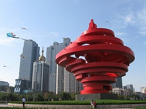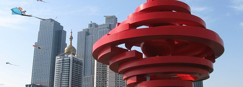 Jetzt habe ich mal „4.Mai Platz“ (五四广场 Wǔsì guǎngchǎng) im neuen Zentrum der Stadt aus der Nähe gesehen. Der Platz oder das Denkmal darauf sind ein Wahrzeichen Qingdaos. Das Denkmal soll, wie mir gesagt wurde, einem Tornado ähneln und den Geist der Bewegung des 4. Mai darstellen.