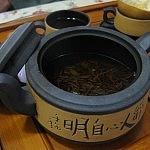 Man stellt auf eine „Teeplatte“ (茶盘 chápán) Tassen mit Untertassen und eine Teekanne. In die Teekanne füllt man etwas Tee und gießt diesen mit kochendem Wasser auf. Der Tee sollte etwa drei Minuten ziehen. Der erste Aufguss wird jedoch nicht getrunken, sondern wird benutzt um die Teetassen einmal auszuspülen. Diesen Tee kann man einfach auf die Teeplatte gießen, diese hat ein kleines Rohr durch die der Tee abfließen kann. Weil man die Teeplatte danach aber wieder sauber machen muss, haben wir den Tee aber einfach in eine Schüssel gegossen. Den zweiten Aufguss kann man trinken.