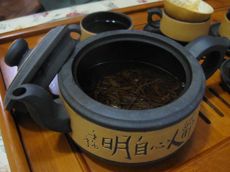 Man stellt auf eine „Teeplatte“ (茶盘 chápán) Tassen mit Untertassen und eine Teekanne. In die Teekanne füllt man etwas Tee und gießt diesen mit kochendem Wasser auf. Der Tee sollte etwa drei Minuten ziehen. Der erste Aufguss wird jedoch nicht getrunken, sondern wird benutzt um die Teetassen einmal auszuspülen. Diesen Tee kann man einfach auf die Teeplatte gießen, diese hat ein kleines Rohr durch die der Tee abfließen kann. Weil man die Teeplatte danach aber wieder sauber machen muss, haben wir den Tee aber einfach in eine Schüssel gegossen. Den zweiten Aufguss kann man trinken.
