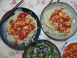 Abends esse ich Zuhause mit meiner Gastfamilie. Es gibt immer etwas Warmes. Es gibt nicht nur chinesisches Essen. Meine Gastfamilie isst gerne auch mal Pizza oder 意大利面 (Yìdàlì miàn, „Italienische Nudeln“).