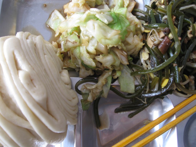 In der Mensa nehme ich aber manchmal auch etwas mit Fleisch und sortiere mir das dann raus. So habe ich einfach mehr Auswahl, weil es dort immer wieder die gleichen Gerichte gibt. Es gibt immer verschiedenes Gemüse, Reis und oft auch Mántou (馒头, weißes, Brot aus Hefeteig). Außerdem gibt es, wenn man früh genug kommt auch noch ein wechselndes Angebot mit Fleisch und anderem. Einmal gab es sogar Reibeplätzchen.