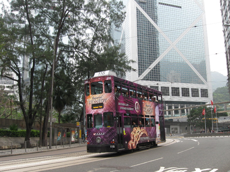 - dünne Doppeldeckerstraßenbahn auf Hongkong Island