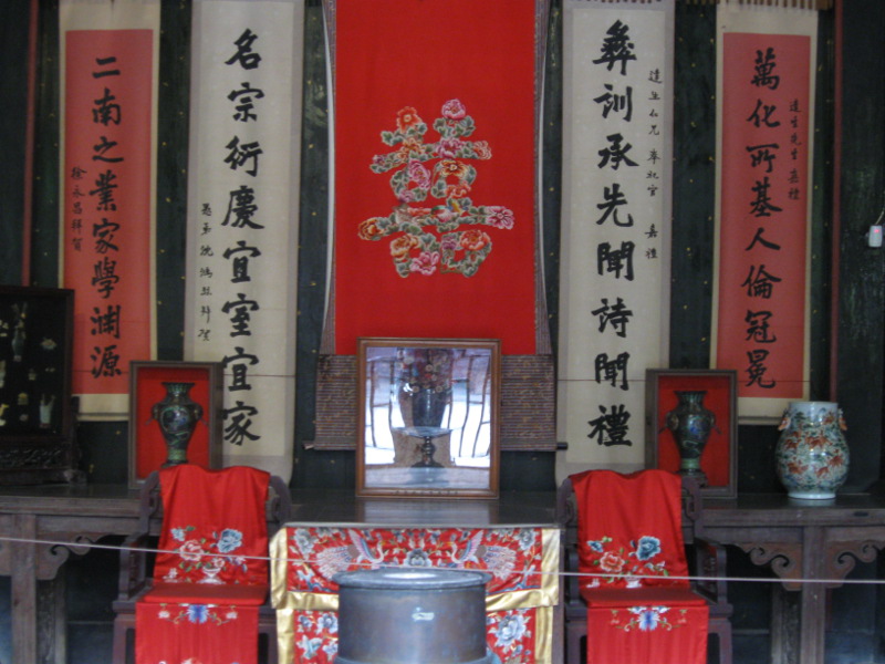 Hochtzeitsraum im Haus von Konfuzius. Das Zeichen auf dem roten Stoff (囍) steht für Glück uns sieht man oft wenn irgendwo eine Hochzeit stattfindet und stattgefunden hat. Oft bleiben die Zeichen aus (rotem) Papier noch lange hängen.