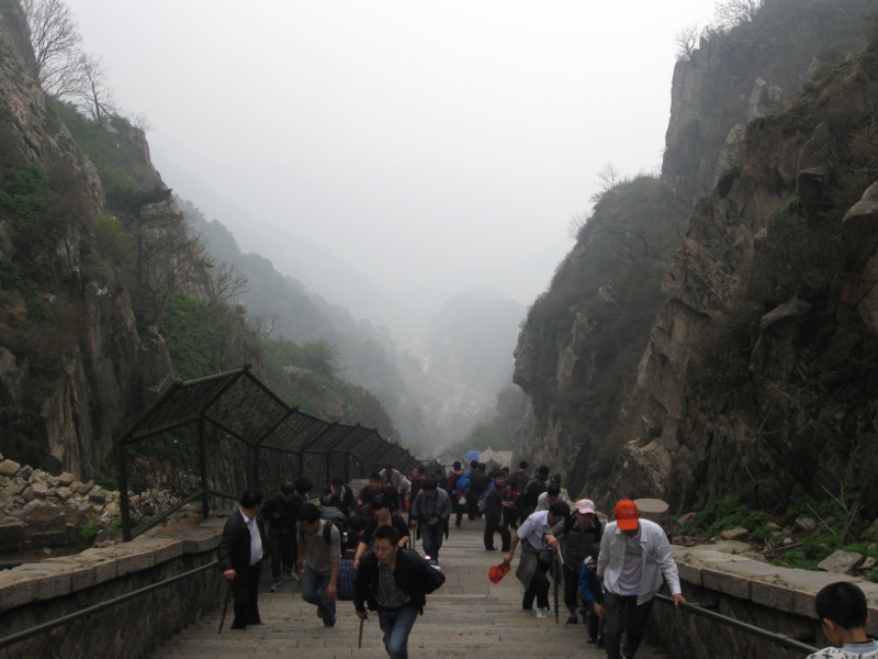 Am nächsten Tag sind wir dann auf den Tài Shān (泰山) gestiegen, wo ich im Oktober schon einmal war. Dieses Mal haben wir allerdings die nicht ganz so anstrengende Variante gewählt und sind nur die Hälfte der Stufen gelaufen. Außerdem war es sogar noch ein bisschen nebliger und es waren weniger Leute dort (schließlich waren keine Feiertage, bei Feiertagen auf einen heiligen Berg in China zu wollen ist nämlich nicht unbedingt die beste Idee).