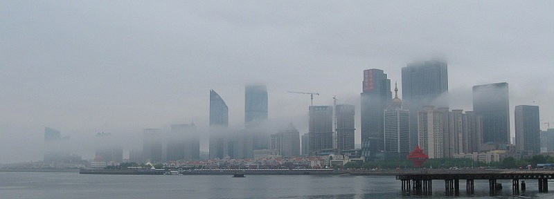 Vom Segelzentrum aus hat man einen sehr schönen Blick auf die Skyline vom „neuen Qingdao“, die heute einige Zeit in Nebelschwaden lag.