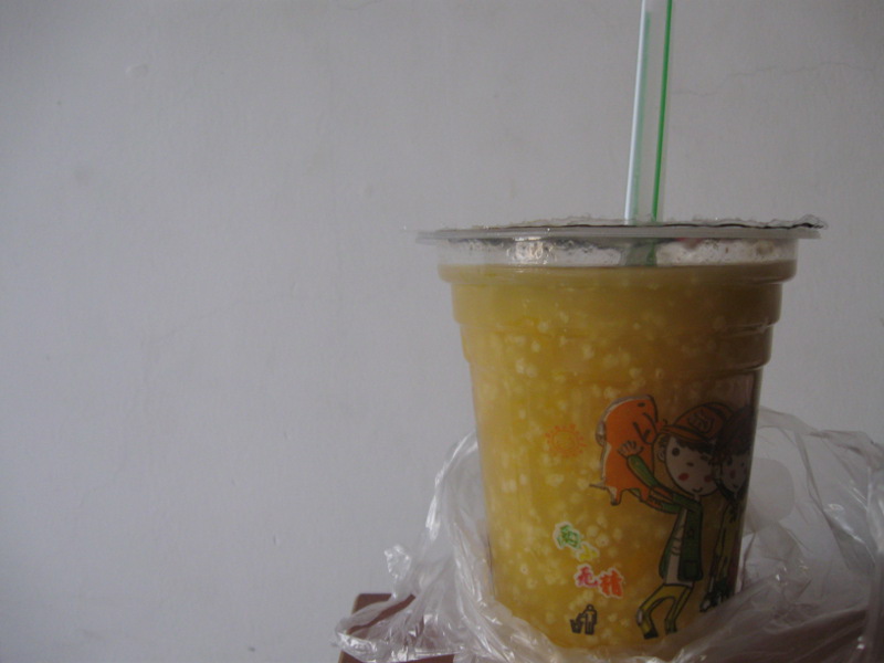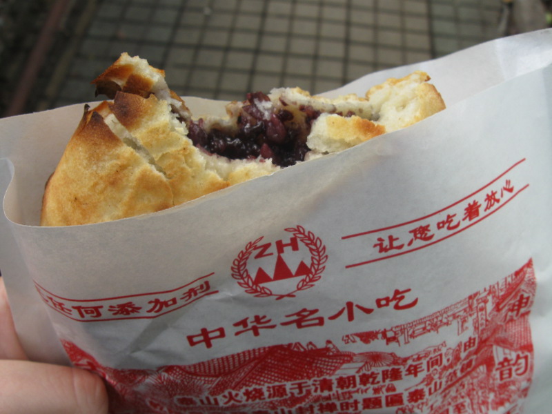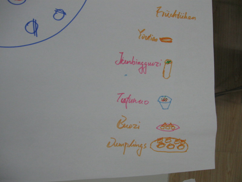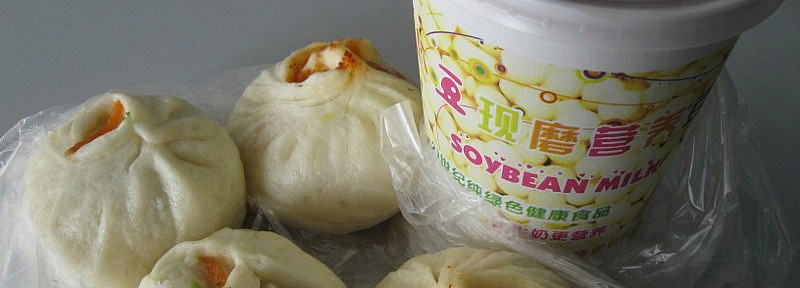 In Deutschland werde ich dafür dann wahrscheinlich Bāozi (包子)und Sojamilch (豆浆 Dòujiāng) vermissen. Sojamilch mochte ich in Deutschland nie besonders gerne, aber hier gibt es heiße, frische Sojamilch (wahlweise mit oder ohne Zucker), sie schmeckt ein bisschen nussig, finde ich – sehr lecker! Baozi sind kleine Bällchen gefüllte Bällchen aus Hefeteig, die gedämpft werden (wenn irgendwo Baozi verkauft werden, kann man das oft schon an dampfenden Türmen aus Körben in denen die Baozi sind sehen). Es gibt viele verschiedene Füllungen. Zu denen mit Fleisch kann ich nicht viel sagen. An meinem Baozi-Stand gibt es meistens vier vegetarische Sorgen: mit Pilzen, mit Tofu (scharf oder nicht) und mit roter Bohnenpaste (süß). Rote Bohnenpaste fand ich anfangs gewöhnungsbedürftig. Vielleicht lag es auch an dem ein oder anderem Fehlkauf, manchmal konnte ich einfach nicht unterscheiden, ob Gebäck mit Bohnen oder Schokolade gefüllt war… Tja, wer lesen kann… Inzwischen kann ich es lesen, vielleicht schmeckt mir die Bohnenpaste darum jetzt manchmal auch wieder.