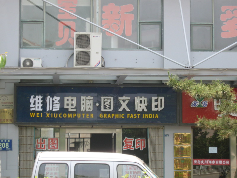 - Meistens fallen mir Übersetzungsfehler nicht so auf, aber das fand ich wirklich lustig: In diesem Laden kann man sich wohl schnell etwas drucken lassen, die Silbe yìn (印) kann „drucken“ heißen, oder im Wort Yìndù (印度) für „Indien“ stehen
