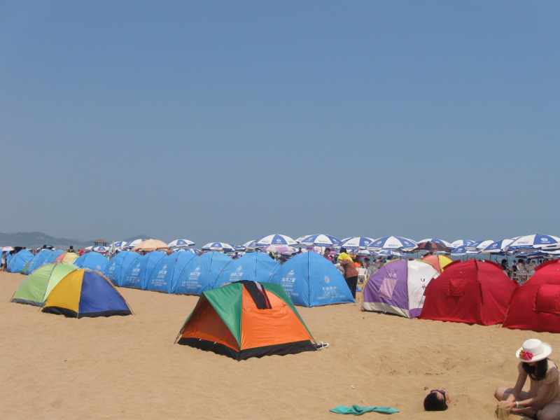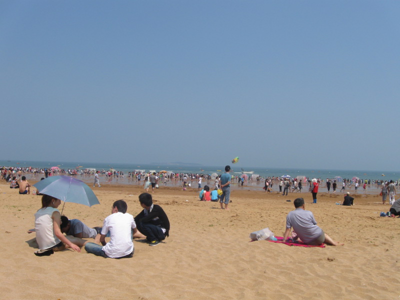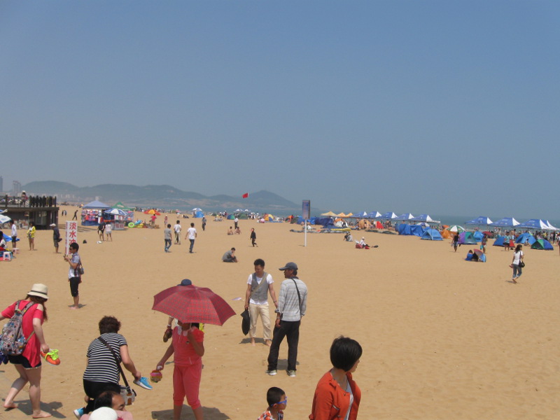 Huangdao gehört auch noch zu Qingdao und hat schöne Landschaft und zwei große Strände zu bieten: Den Silbernen und den Goldenen Strand. Wir sind mit der Fähre auf die Halbinsel gefahren, fast den ganzen Tag am „Goldenen Strand“ (金沙滩) verbracht und schließlich mit dem Bus durch einen Tunnel unter dem Meer zurück. Am Strand war es ganz anders, als ich es aus Deutschland oder Westeuropa kenne. Fast niemand war zum Baden oder Sonnen dort, denn viele Menschen hier können gar nicht schwimmen und wollen auch nicht braun werden. Voll war es trotzdem. Voll Menschen und voll Sonnenschrime und Zelten.