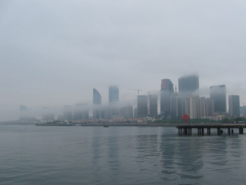 Vom Segelzentrum aus hat man einen sehr schönen Blick auf die Skyline vom „neuen Qingdao“, die heute einige Zeit in Nebelschwaden lag.