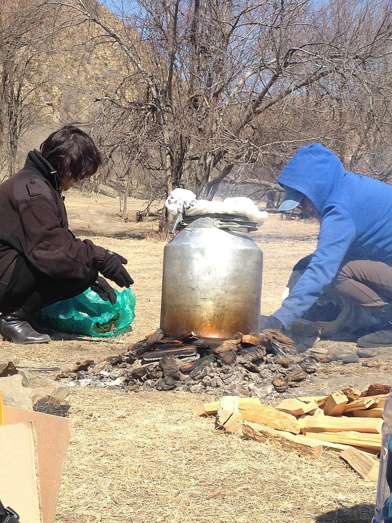 Theaterstück einzustudieren und weitere kreative Angebote gemeinsam mit den Kindern durchzuführen. Zur Mittagszeit traf dann die Schulleitung ein, die wie jedes Jahr ein großes traditionelles mongolisches Essen zubereitete: Chorchog. Bereits vor drei Wochen habe ich schon einmal bei der Zubereitung dieses leckeren Essens dabei sein dürfen. Hierfür wird (Schafs-)Fleisch mit heißen Steinen in eine große Milchkanne gegeben und auf einer Feuerstelle einige Stunden gegart. Die Zutaten dabei sind ganz variabel – auf dem Bild