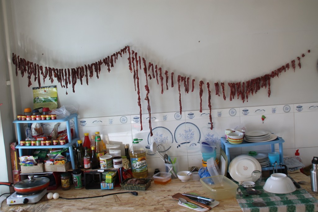 Von der Oma bis zum Neugeborenen schliefen wir zu vierzehnt in einer Jurte, dicht an dicht, auf dünnen Decken. Geweckt durch die Kamele und Schafe, die jeden Morgen zu den Jurten kamen um gemolken zu werden, wurde auch unser restlicher Tag vom Rhythmus der Tiere bestimmt. Das Essen bestand aus Milch, Butter, Quark, Fleisch und diversen weitern Milchprodukten, die mit etwas Reis oder Boortsog (frettiertem Brot) gegessen wurden. Getrunken wurde Milch: Am Morgen als Tee und über den Tag als Airag. Nach drei Tagen ohne Wasser, es gab schlicht kein Trinkwasser in der Umgebung, hatte ich solche Bauchschmerzen von der Milch, dass mein Gastvater die 2 Stunden ins nächste Dorf fuhr, um Wasser zu kaufen.