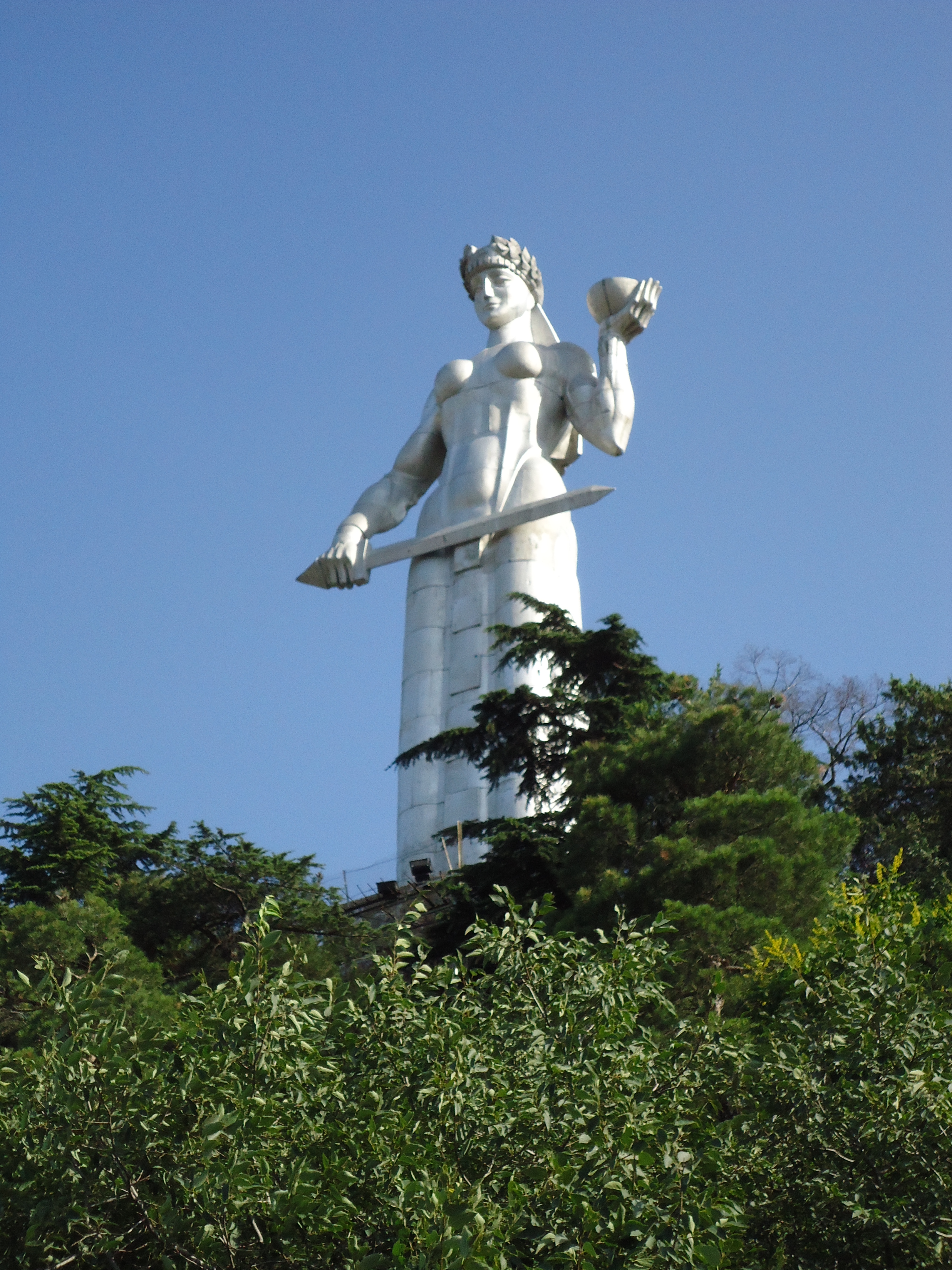 Die Mutter Georgiens hält in ihren Händen ein Schwert (Abwehr von Feinden) und eine Schale (Gastfreundschaft gegenüber Freunden)