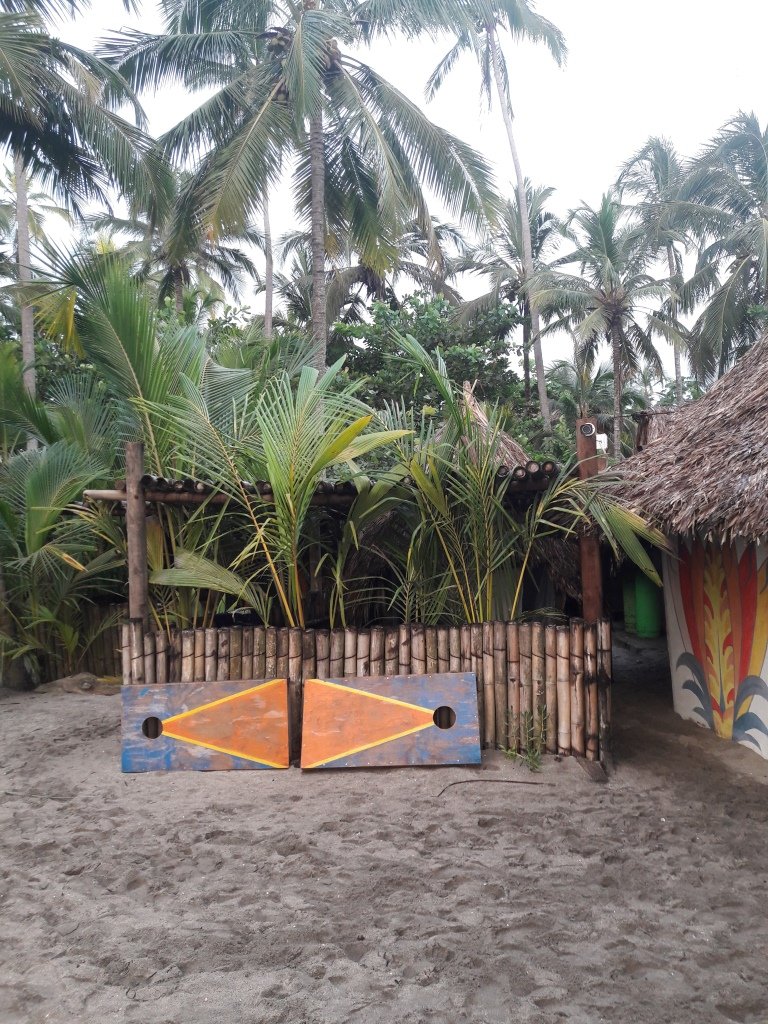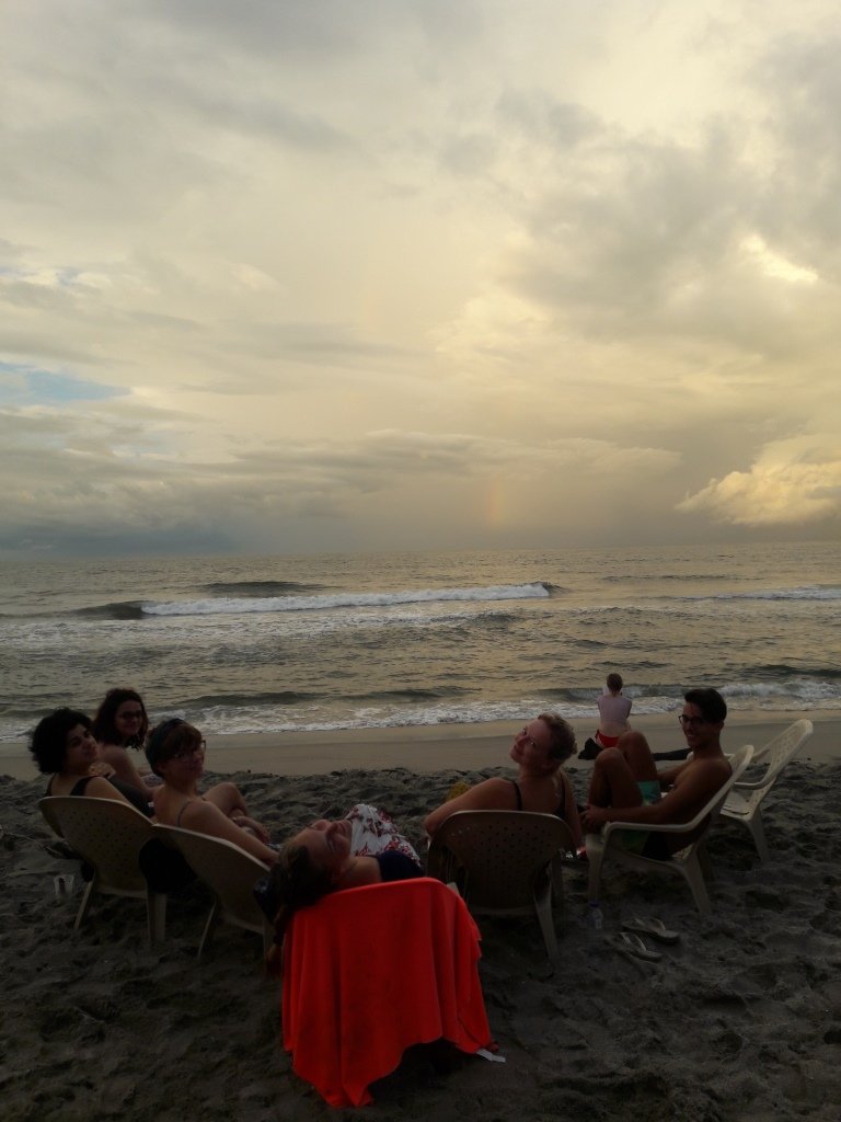 Nach 5 erschöpfenden Tagen im Dschungel mit Ausflügen zu einer tollen Kaffeefinca und zu Wasserfällen, mit stürmendem Regen in wilder Natur und einer gemischten Stimmung in der Gruppe zieht es uns wieder an die Küste. Ich bin als Einziger noch gesund geblieben. Das Wochenende nach dem Seminar verbringen wir in Costeño Beach, östlich des Tayrona-Parks. Im Mototaxi fahren wir durch Palmenwälder zum Hostal Brisa Tranquila. Uns erwarten Traumstrände, Kokosnüsse und Surferwellen. An einer Flussmündung lassen wir uns ins warme karibische Wasser treiben, bevor wir uns einen Fisch grillen lassen und abends in Riesenhängematten unter Palmen entspannen.