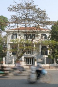 Gelandet und tatsächlich abgeholt worden von einem netten vietnamesischen Fahrer der mit „Pia feyh – Goethe Institut Hanoi“ auf mich wartete. Wie im Film. Auf der Fahrt nach Hanoi rein (ca. 30 Minuten) haben wir kaum geredet. Ich musste erstmal mein Asperin im Körper verstreuen und der Fahrer war wahrscheinlich überfordert. Ich habs dann irgendwann auf Englisch versucht, Wetter, Landschaft und Small Talk. Aber er hat nur doof geguckt und mit den Schulter gezuckt. Irgendwann hab ichs erneut probiert mit einem 08/15 englsichen Satz und er hat wieder nur ratlos den Kopf geschüttelt und am ende war es mir als hätte er „was?“ gefragt. Ich sah mich um. Mhm..wir saßen in einem Sprinter vom Goethe Institut. Nagelneu mit Logo und Vollausstattung. Hmm…vielleicht kann der ja…?Als wir ausgestiegen sind kame eine aus dem Institut rausgerannt um mir zu helfen. Sie unterschrieb ein Blatt für den Fahrer, guckte ihn an und sagte: „Und gut durchgekommen?“ und der vietnamesische Fahrer sagte auf gutem Deutsch: „Alles bestens geklappt“. Später habe ich erfahren, dass alle in diesem Institut, auch die Techniker und Wächter oder Autoparker mindestens ein bisschen Deutsch sprechen!!!