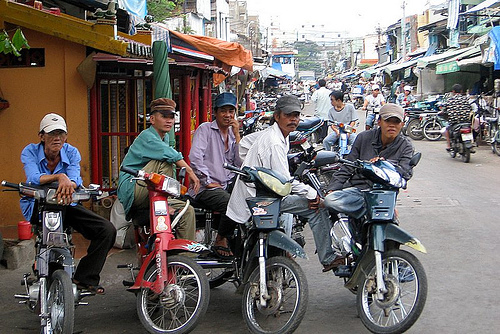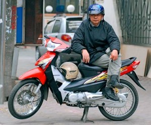 Die Situation ist katastrophal. Mit dem Auto ist man für eine Kölner 5 Minuten Strecke bestimmt 20 Minuten on tour, selbst ohne Verkehrsregeln und Ampeln wie hier. Die Motorbikes folgen rein gar keinem System. Sie fahren 8-12 spurig und außer an den riesigen Kreuzungen, gibt es keine Ampeln oder Schilder. Die einzige Verkehrsregel die es hier unausgesprochen gibt ist: In die Kreuzung reinfahren und hupen. Es wird nur gehupt. Die ganze Zeit. Aus Angst übersehen zu werden, als Warnung oder als Verwarnung, weil der Nebenmann zu nah dran ist oder der Vordermann zu langsam. Mit dieser „Fahrweise“ ist man natürlich weitaus schneller unterwegs. Und nur so kann der Verkehr in Hanoi noch funktionieren. Trotzdem versetzten diese 1,5 Millionen Motorräder die Stadt in einen ständigen Ausnahmezustand. Viele Touristen sind damit total überfordert. Und ich schlendere nichts ahnend durch die Nacht, bis mich ein hagerer Mann entdeckt, der vorher noch gemütlich auf seinem Motorrad gesessen hatte. Er flippt die Kippe weg und zeigt aufgeregt auf meinem Helm. Neugierig wie ich bin, ging ich zu ihm hin. Erst nach einem wild gestikulierendem „Gespräch“ habe ich dann verstanden, was er mir anbieten wollte. Ich habe ihm meine Adresse auf einen Stift aufgeschrieben und einen Preis vorher abgemacht. Dann hab ich mich hinten daraufgesetzt und er hat mich durch die tiefe Nacht 15 Minuten nach Hause gefahren. Für umgerechnet 80 Cent. Danach war ich wie beschwipst. Das ist schon was anderes ob man bei einer jungen zarten und vorsichtigen vietnamesischen GI-Mitarbeiterin hintendrauf sitzt, oder sich zitternd an die Jackenreste eines fremden Mannes klammert. Der ist durch diesen Wahnsinnsverkehr so schnell durch.