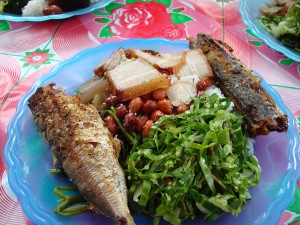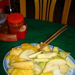 Da hab ich mir dann endlich Milch kaufen können und Wasser mit Kohlensäure. Davon gibt es aber auch nur ein Produkt und allgemein ist das hier super schwer zu bekommen. Dabei wisst ihr ja, wie schwer ich mich mit stillem Wasser tue. Das ist echt hart: In Deutschland fast zu viel getrunken und sich hier zum trinken zwingen müssen. Alles andere (Obst, Gemüse, Kräuter, Fleisch, Fisch) holt man lieber von der Straße. Preise haben mir Huoang und auch Trang grob erklärt und langsam bekomme ich ein Gefühl dafür, welcher Preis wofür angemessen ist, wann ich handeln sollte und lerne diese bekloppte Währung (als Mathegöttin) in irgendein Verhältnis zu setzen. Kochen werde ich wohl hier kaum oder nie. Geht man auf die Märkte und in die Shops um seine Zutaten zum kochen zusammenzukriegen, bezahlt man am Ende bestimmt das 8-fache mehr, als wenn man sich seinen hochvollgepackten Teller auf der Straße holt.