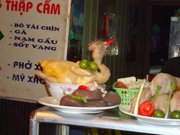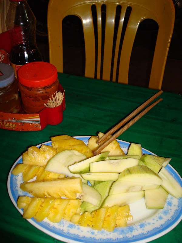 Nach dem Sport hab ich das gemacht, was ich auf Alleinreisen sehr liebe und schätze. A L L E I N E durch die Straßen laufen. Dunkel, nachts und dann die Stadt kennenlernen und checken. Nicht nur orientierungsmäßig, sondern auch ihre Menschen, deren Lebensweise. Und natürlich die Nikon Kamera unterm Arm. Ich habe auf diesem Spaziergang so viel aufsaugen können und so viel gelernt über die Menschen. Irgendwann hab ich Hunger bekommen und mich an eine Garküche gesetzt. Die bieten dann immer Hocker aus Plastik an und so kleine Plastikkindertische, wo die Menschen sich drum rum setzten, oder hocken! Ich hab auf all die unberührten frischen Zutaten gezeigt und er hat es vor mir geschält, geschnitten, zubereitet und wir haben einen netten Preis ausgemacht.Ich hatte Chili Chicken, wie man auf dem Bild (allerdings da noch in Rohfassung) ja unschwer erkennen kann. Danach kam er an und hat mit mir ne Zigarette geraucht. Und wir haben das regen treiben der Nacht beobachtet. Der ältere Vietnamese und ich. Auf Kinderplastikstühlen, ner Kippe und zum Nachtisch hat er mir ne frische grüne Mango geschält und Ananas dazu.