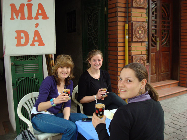 Ziel ist es hier, möglichst viel mit denen auf Deutsch zu reden, geschrieben wird gar nicht. Sarah hatte Bilder ausgedruckt, wo Menschen in Deutschland und Vietnam Einkäufe erledigen, im Park spazieren, shoppen, zum Sport gehen etc. und wir haben die gefragt, was sie sehen, was sie von den Bildern denken. Sarah ging es bei diesen Äußerungen natürlich nur um die Phonetik. Ich hingegen hin an ihren Lippen und wollte am liebsten sämtliche Türen verriegeln und diese Menschen dazu zwingen, einfach weiter zu erzählen. Phonetik hin oder her. Ich hätte am liebsten mein Aufnahmegerät aufgestellt. Höchstinteressante Dinge über die Vietnamesische Denken- und Lebensweise sind da rausgekommen. Habe in den 2 Stunden unheimlich viel gelernt über das Alltagsverhalten und Denkensweisen von Vietnamesen in unserem Alltag. Ich freue mich schon auf die nächste Stunde. Mittags gehen Sarah und ich meistens mit Ooona essen. Hocken uns auf die Plastikstühle einer Garküche und essen und reden und trinken danach irgendwo Kaffee, tauschen uns aus, genießen die Sonne und beobachten die Szene.