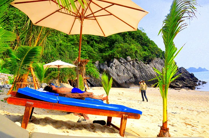 Eine Insel, dicht bewachsen und ne wunderschöne Bucht links und rechts. Wir hatten tatsächlich ein komplettes Resort nur für unsere Gruppe (ca. 12 Leute) und eine Bucht ohne andere Besucher. Als wir vom Boot runter stiegen und die Füße den Sand berührten, als wir wenig später mit netten Menschen zusammen im Liegestuhl saßen, die Sonne auf die Haut drückte und wir schon am ersten Bierchen nippten, war ich total überfordert. Ich konnte einfach nicht glauben, wo ich grade bin, wie schön das alles ist. Naja kurz gesagt: Ich hab mich nicht mehr eingekriegt. Ich habe versucht auf Deutsch, Französisch und Englisch kundzutun, wie toll das hier ist und am Schluss aus meiner Verzweiflung noch auf Kölsch einen oben drauf gesetzt.