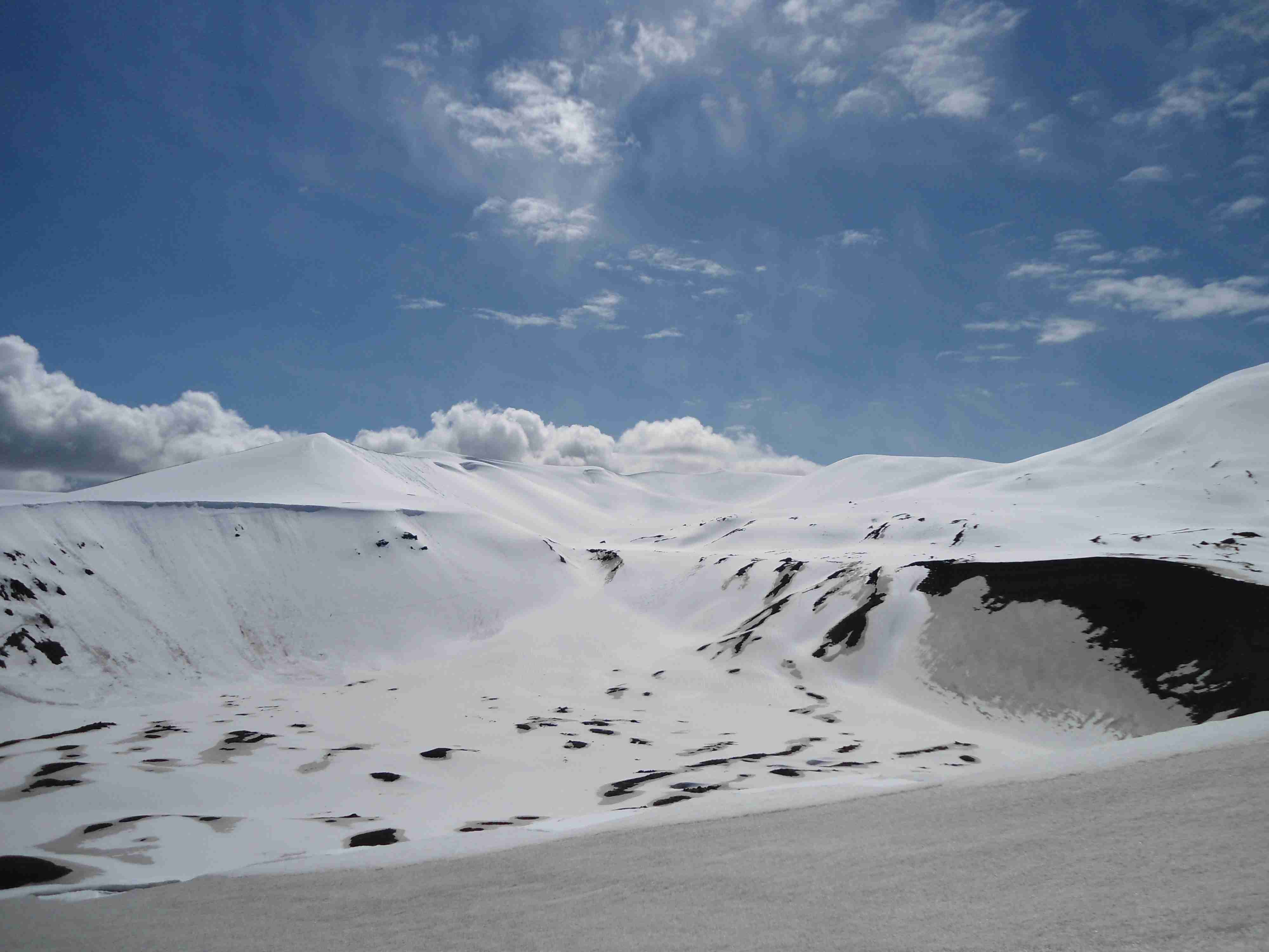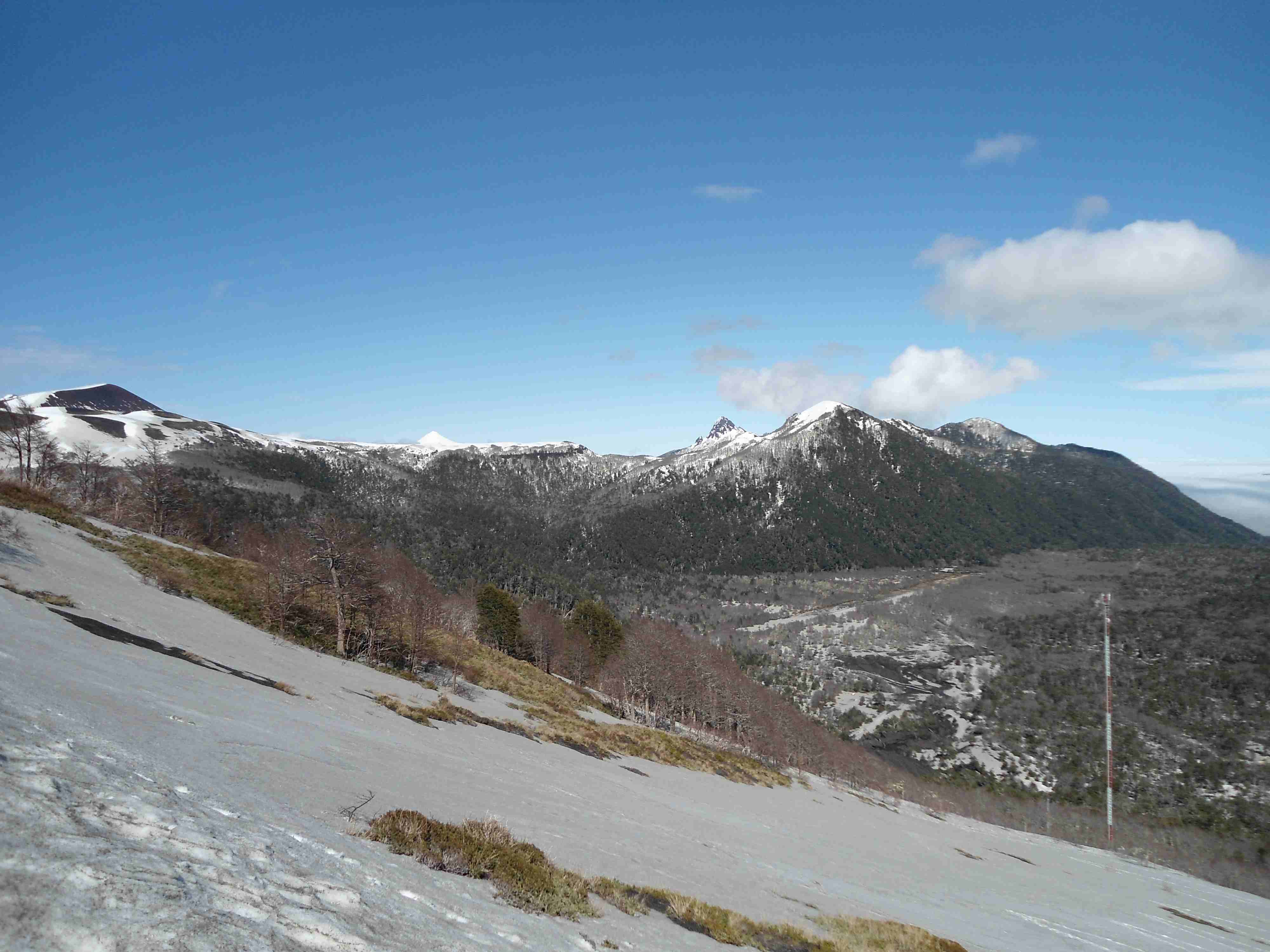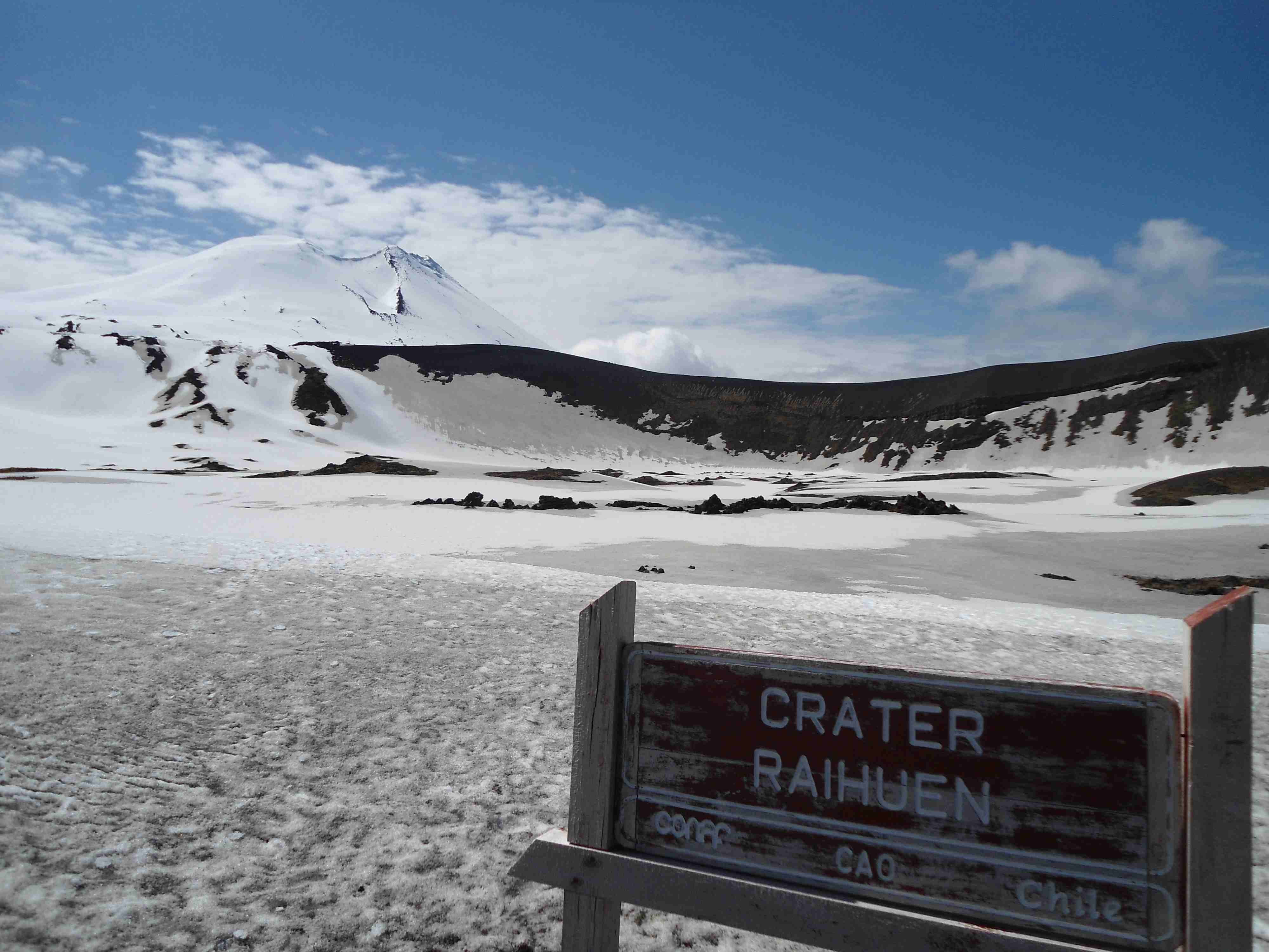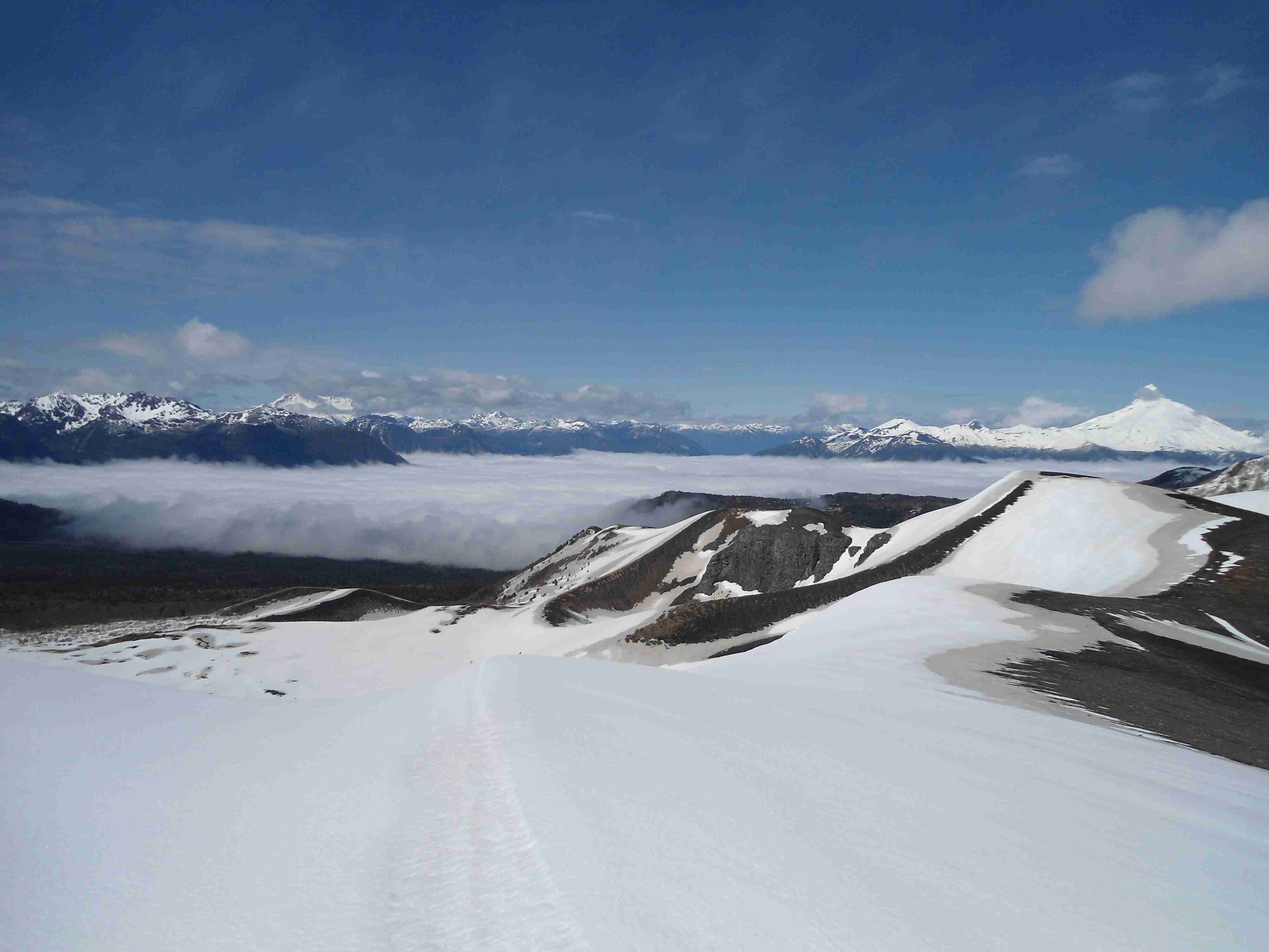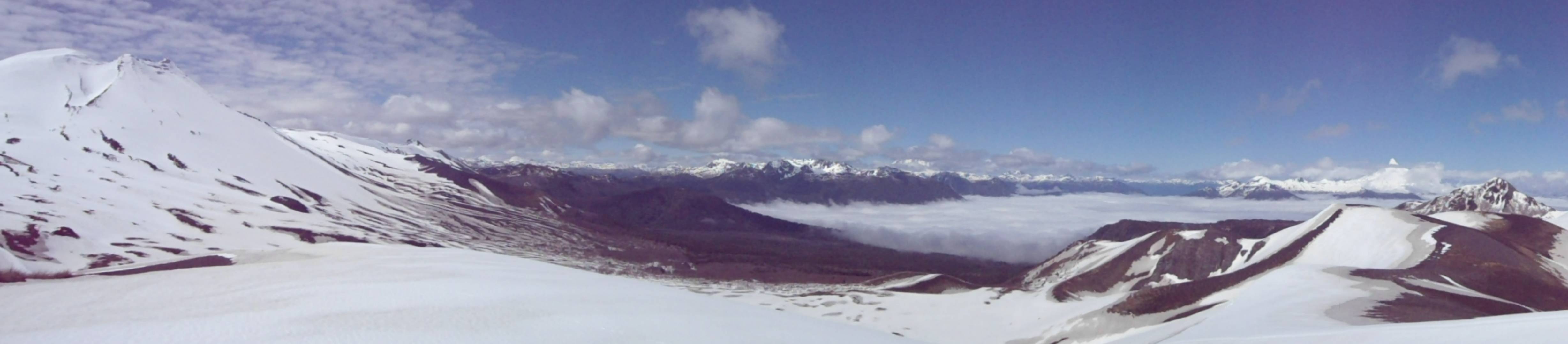 Nach circa 45 Minuten erreichten wir den Krater Raihuen, einer von vielen in dieser Region. Die Aussicht war herrlich, so weit das Auge reichte schneebedeckte Gipfel und keine Wolke am Himmel (naja, ein paar Wolken schon):