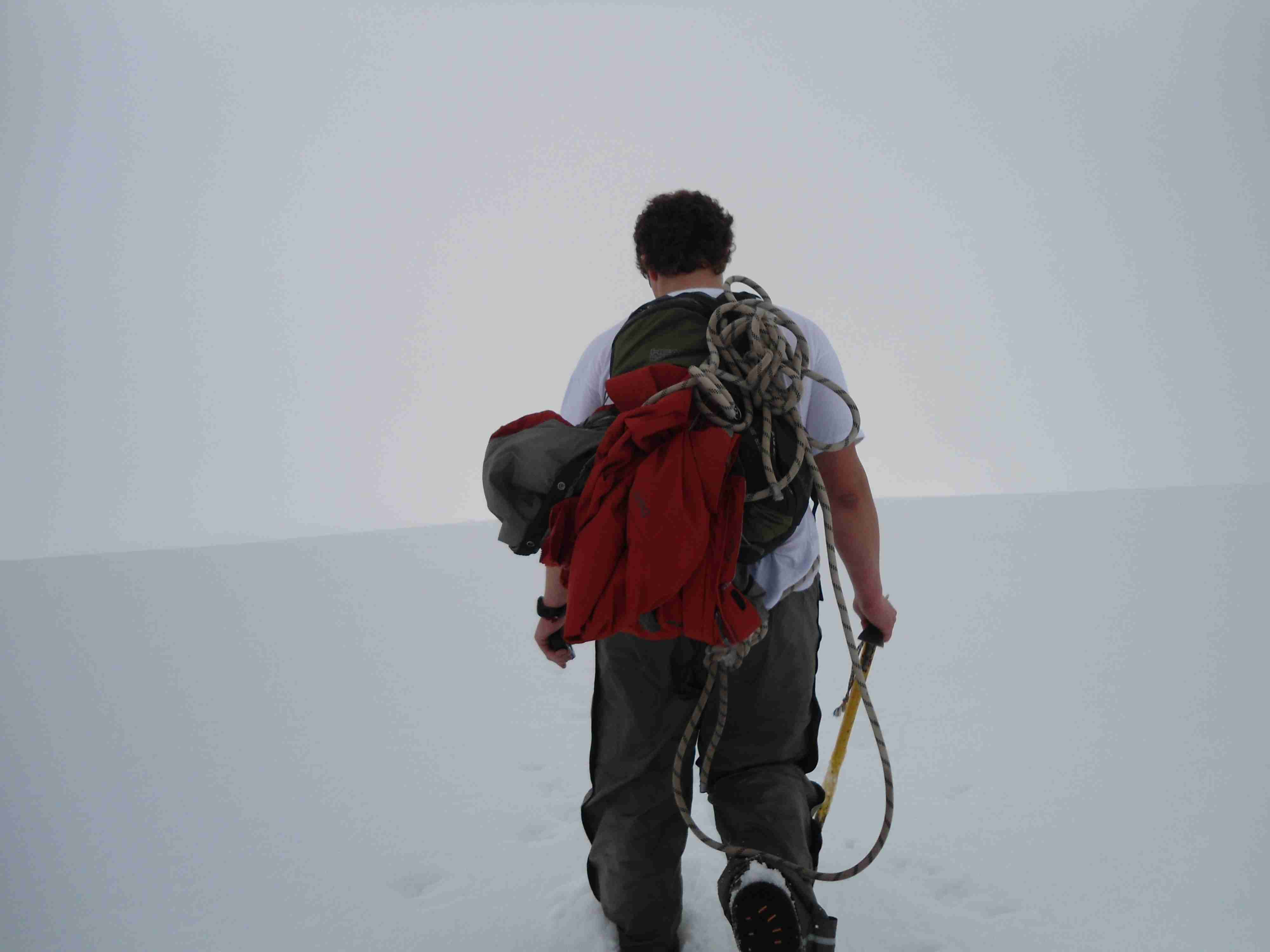 Ab jetzt mussten wir uns also vollkommen auf das GPS verlassen, wobei wir weiterhin hintereinander in einer Linien liefen. Zusätzlich schrie Javier uns in regelmäßigen Abständen etwas zu, um uns die Orientierung im Nebel zu erleichtern. An einem steileren Hang setzten wir uns in den Schnee und rutschten hinunter, um schneller zu sein. Dabei hielten wir die Pickel mit beiden Händen quer vorm Körper, um bremsen zu können. Circa 5 Minuten dauerte die Rutschpartie, wofür meine Jeans natürlich nicht geeignet war; aber irgendwann hatte ich kein Gefühl mehr im „Hintern“ und es wurde erträglicher. Nach fast 30 Minuten (für den Aufstieg hatten wir, wie gesagt, 2 1/2 Stunden gebraucht) erreichten wir die wartende Gruppe am Fuße des Vulkans. Diese Wetterumschwünge, so hatte ich mir sagen lassen, treten in den Anden, und wahrscheinlich in jedem Gebirge, oft auf. Manchmal werden sie auch von starken Winden begleitet, die die Berge „hinuntergefallen“ kommen.