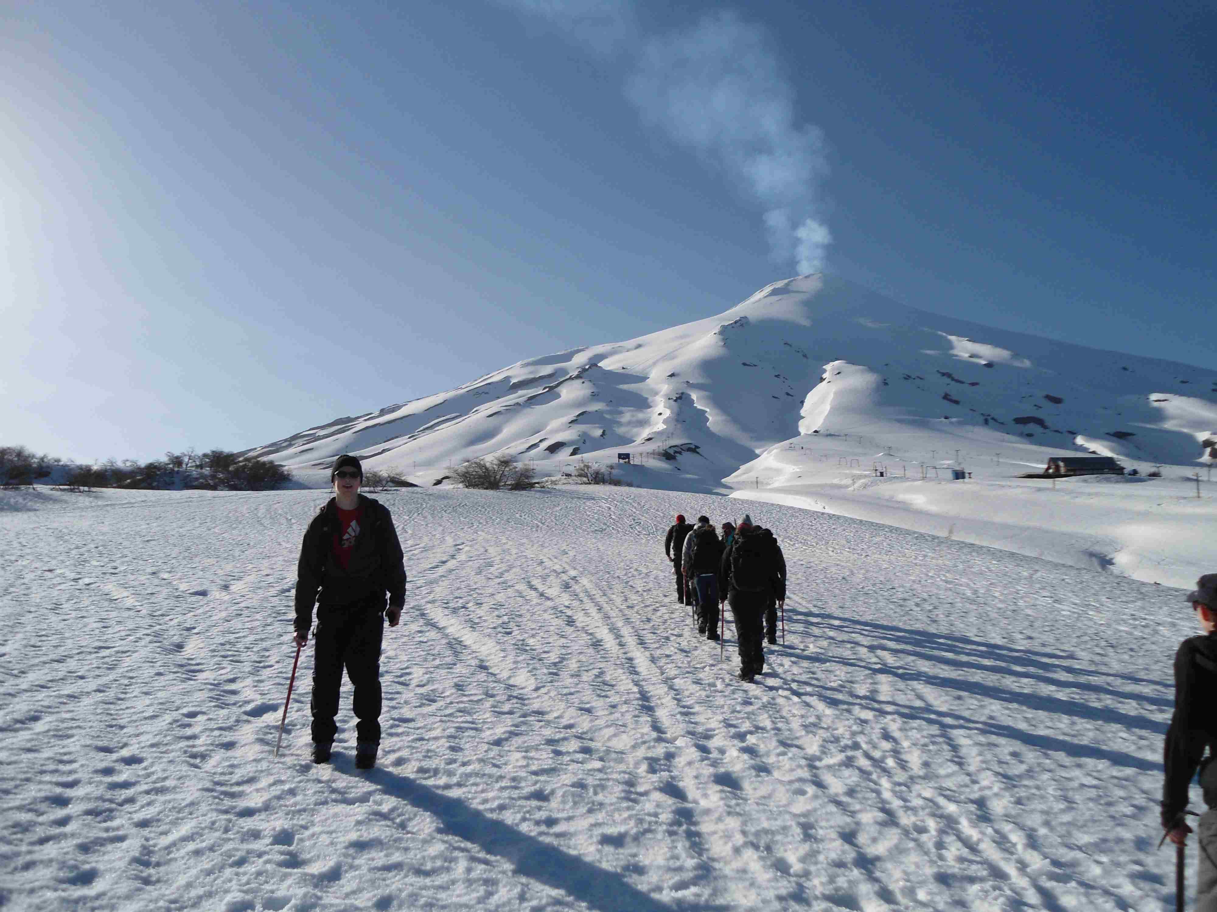 Voll ausgerüstet mit Proviant, Schneehose, Schneejacke, Schneestiefel, Plastikschale (für den Abstieg, zum herunterrutschen ;)), Eispickel, Helm, Sonnenbrille und sogar einer Gasmaske (für den Fall, dass der Rauch in der Umgebung des Kraters zu viel werden würde) fuhren wir dann gegen 7 Uhr am Morgen mit dem Bus los, Richtung Vulkan Villarrica.