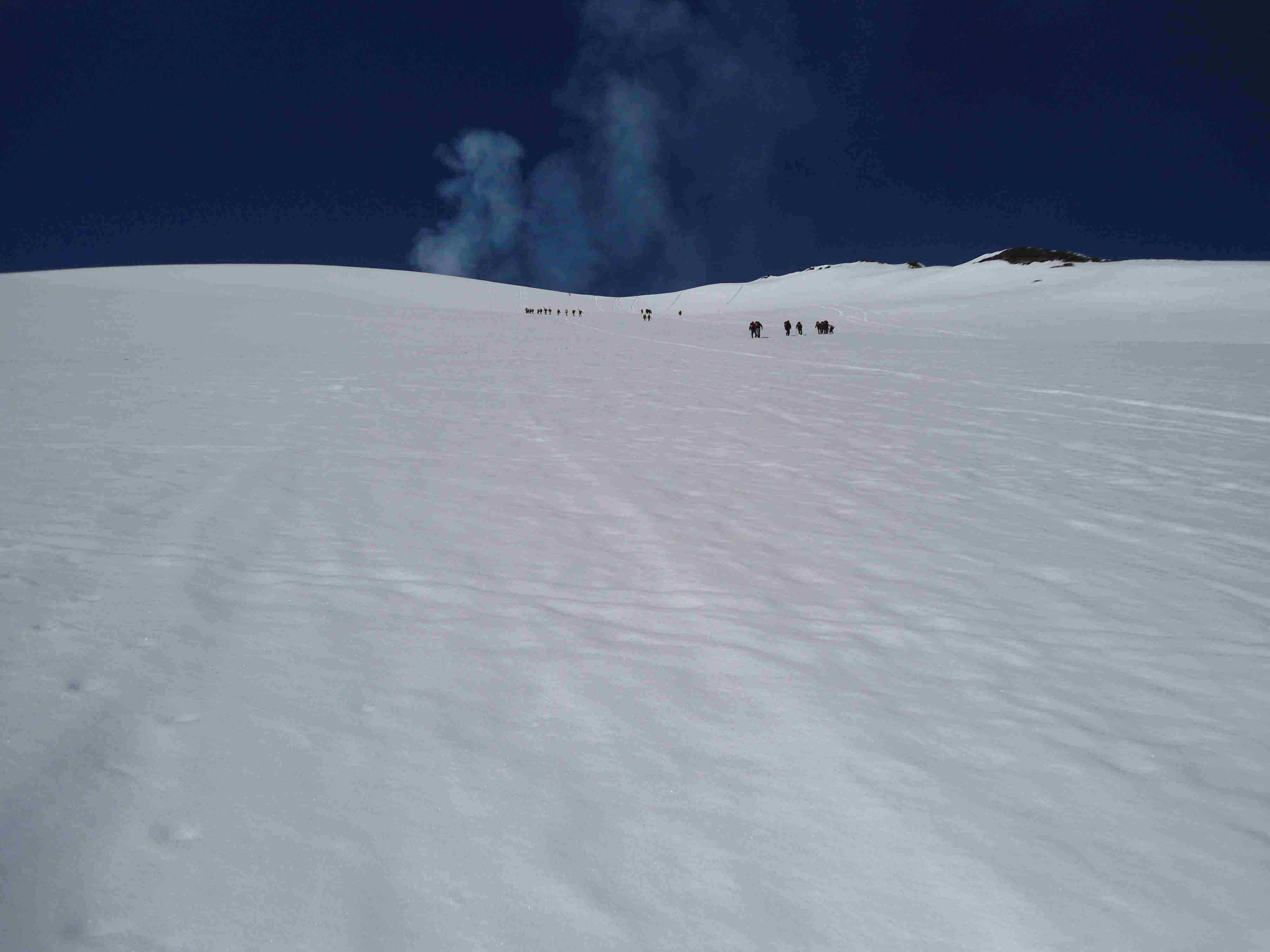 Auf 1600 Höhenmeter wurde wir schließlich abgesetzt und mit einem traumhaften Blick auf den weißen, sonnenbeschienenen Vulkan und der aus dem Krater entweichenden Rauchfahne konnte die Besteigung beginnen. Die Gruppe bestand aus circa 20 Personen und 5 Guides.