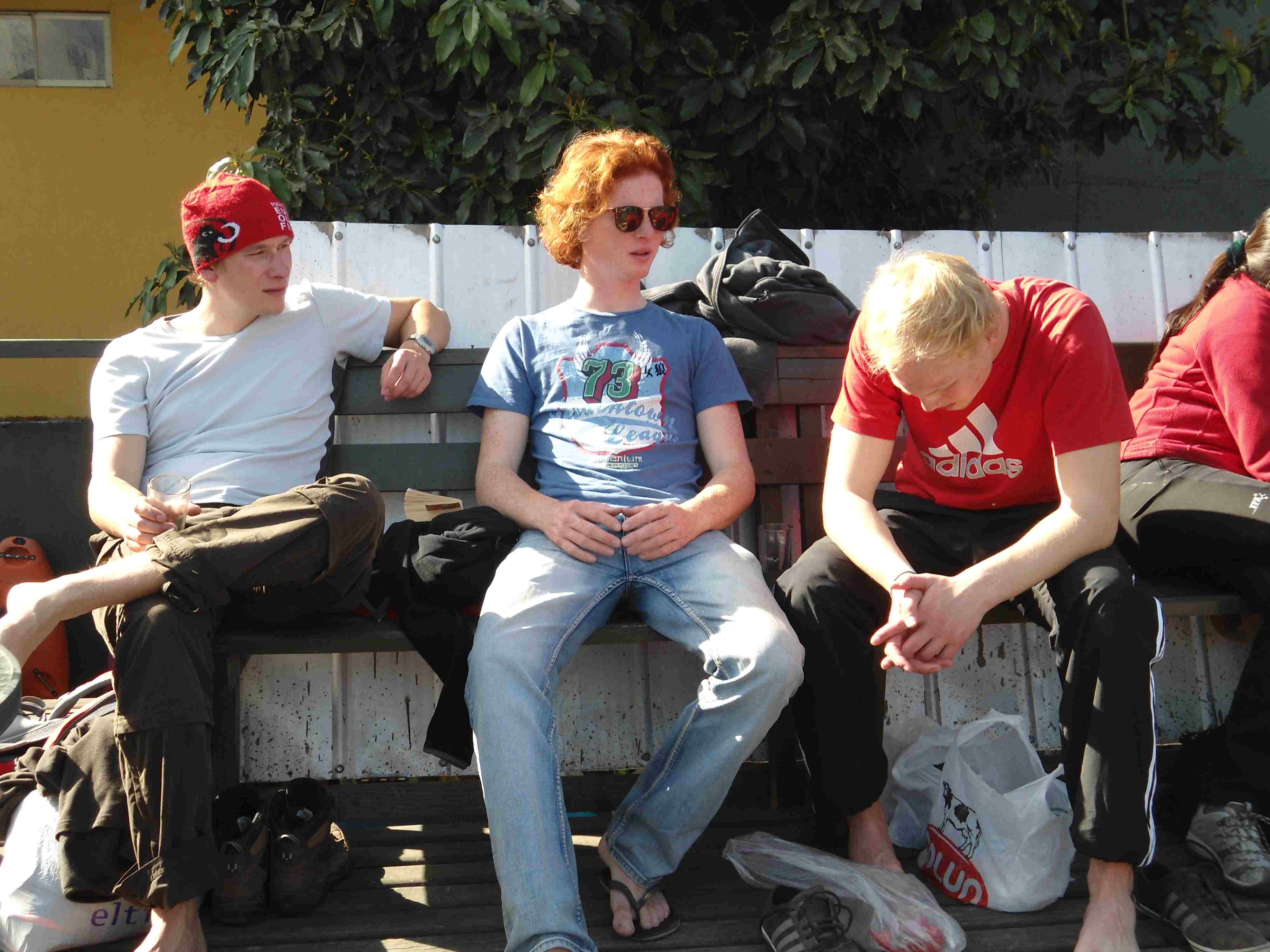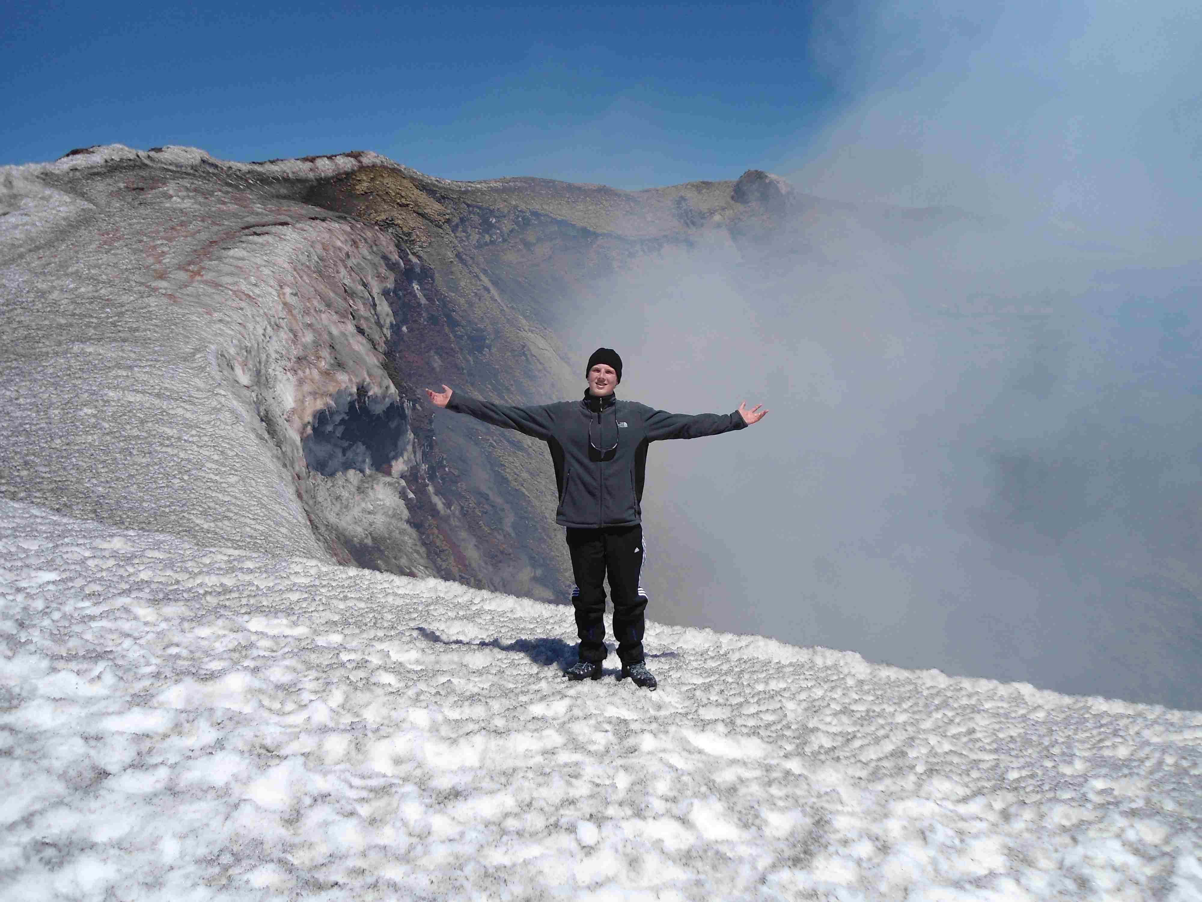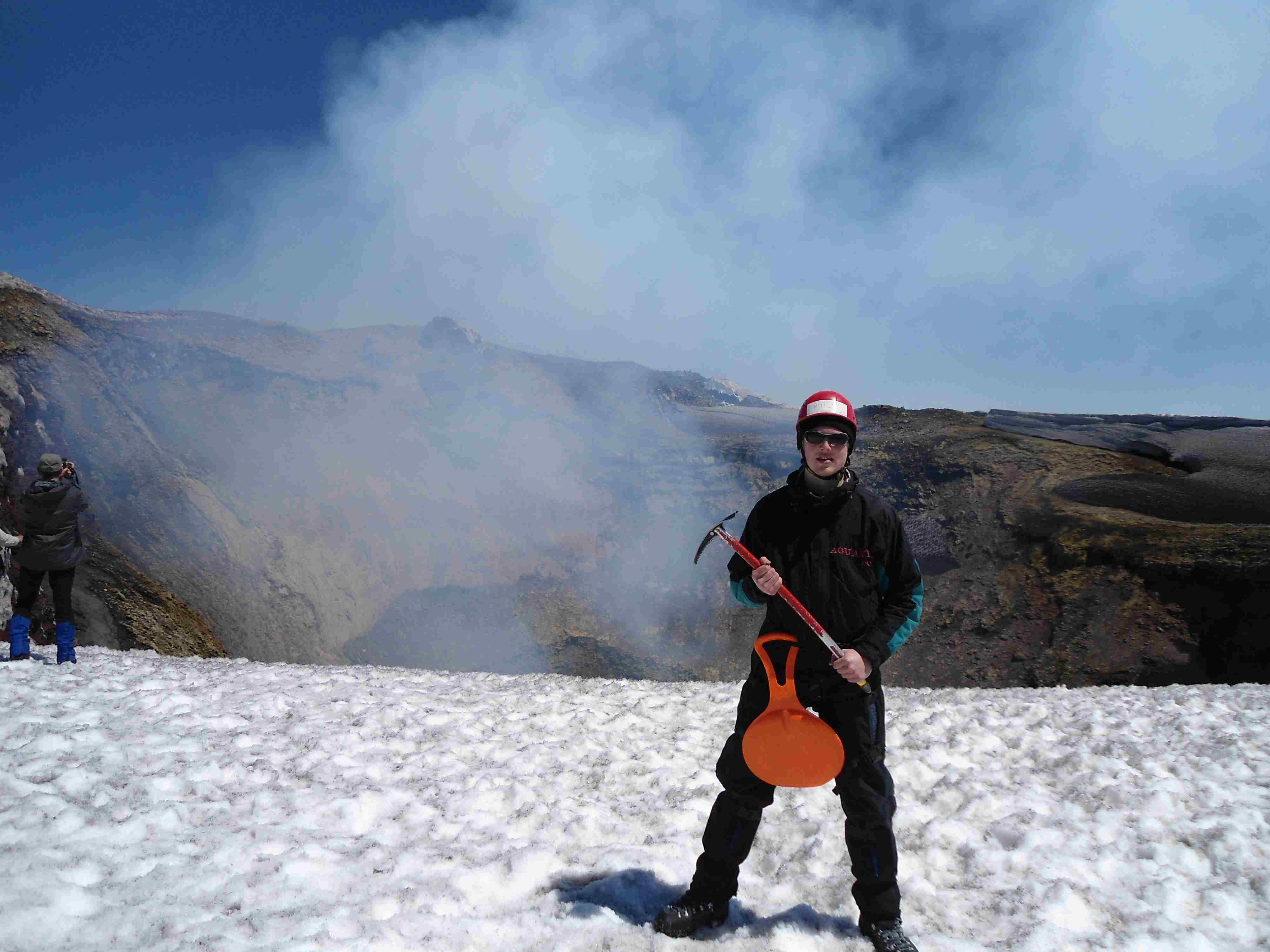 Nachdem wohl die Meisten während des Aufstiegs voll an ihre Grenzen gegangen sind, war das Gefühl umso erleichternder, als wir auf 2840 m Höhe endlich am Krater standen. Obwohl ein grauer Dunst in der Luft lag (Der Vulkan Puyuhue hat mal wieder Asche „gespuckt“), boten sich uns grandiose Aussichten: Der Lago Villarrica am Fuße des Vulkans, die anderen Gipfel der Anden rundherum, wenn auch ein wenig trüb, und natürlich der eindrucksvolle Krater. Da der Pegel der Magma zurzeit relativ niedrig ist, bekamen wir nur den Rauch zu sehen, dennoch hörte man sie im Inneren des Vulkan bedrohlich vor sich hin brodeln. Ab und zu, wenn der Wind sich kurzzeitig drehte, bekamen wir einen Schwall des Rauches ab, der uns alles husten ließ und in der Lunge brannte. Gasmasken waren nach den Aussagen der Guides aber noch nicht notwendig.