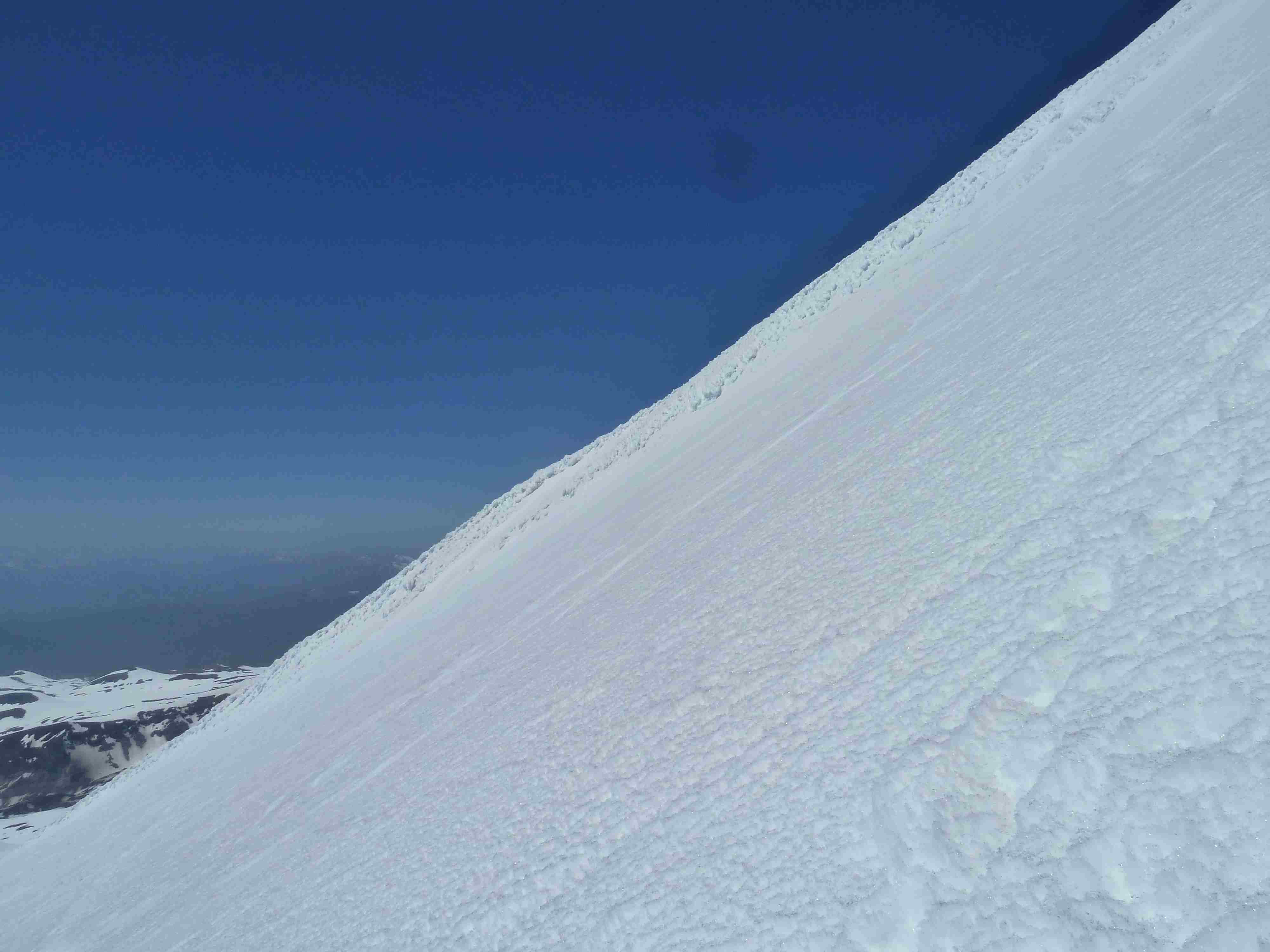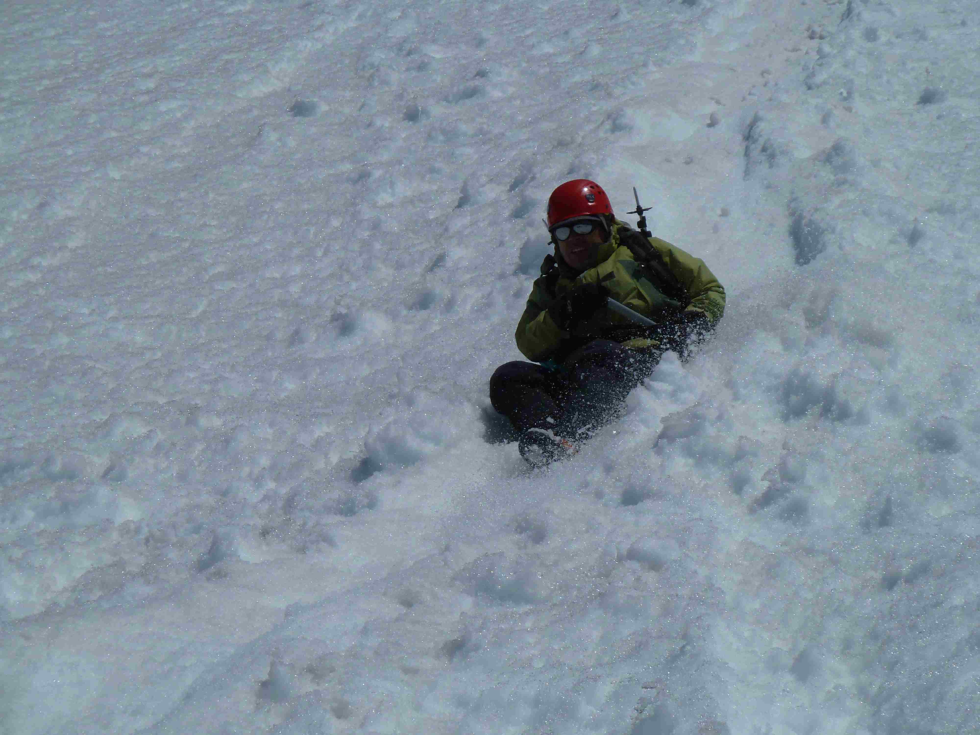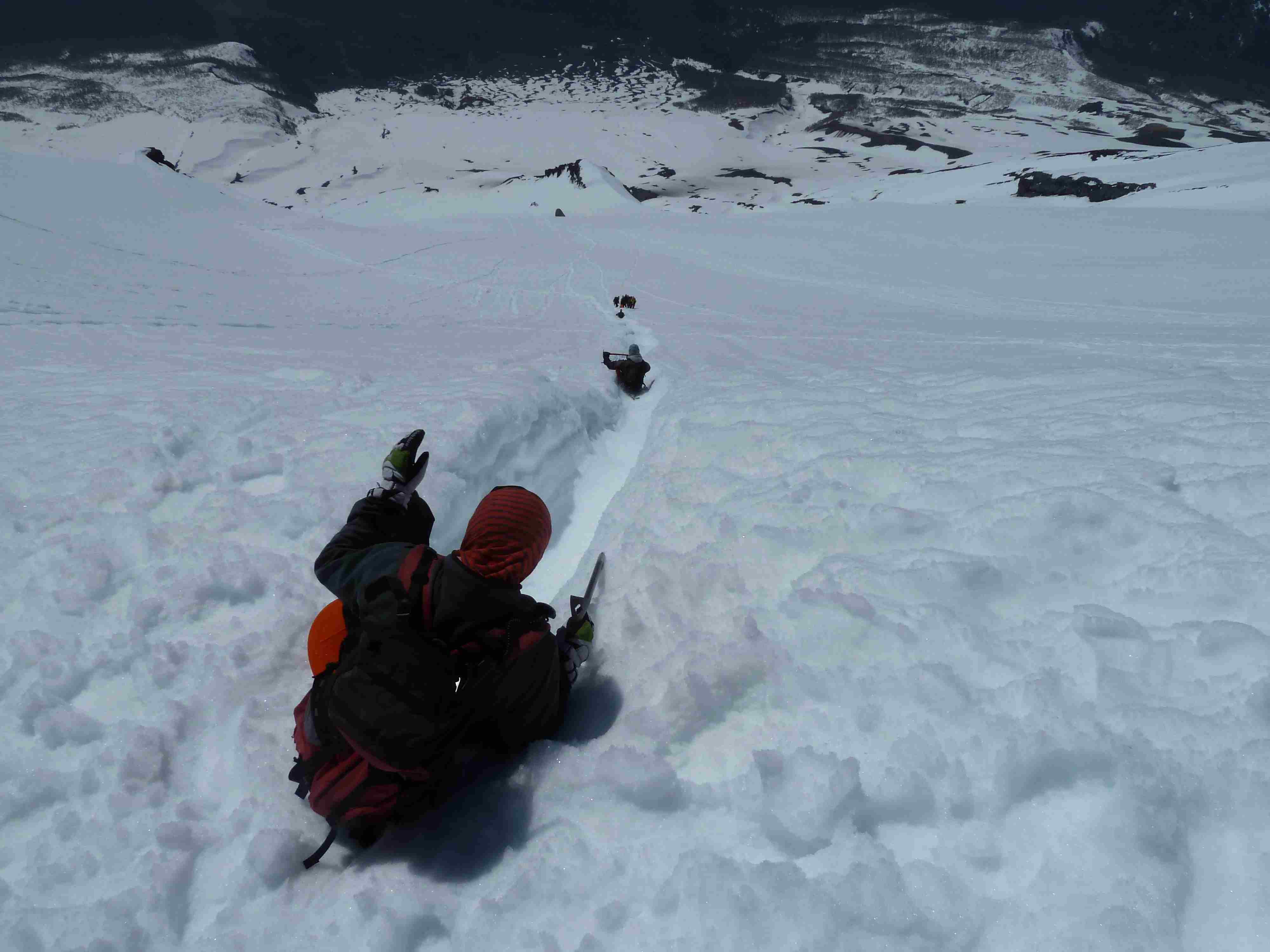 Nach 30 Minuten schließlich machten wir uns bereit für den Abstieg: Schneehose und Schneejacke an, Helm auf, Plastikschale raus und noch einen zusätzlichen Schutz für den Hintern angelegt. Man erklärte uns, dass der folgende Teil der gefährlichste der Tour sei, weil dort die meisten Unfälle passieren (Beinbruch, Rippenbruch, Eispickel im Gesicht). Deshalb sollten wir die Anweisungen der Guides uneingeschränkt befolgen; den Pickel zum Beispiel immer mit zwei Händen fest umgreifen.