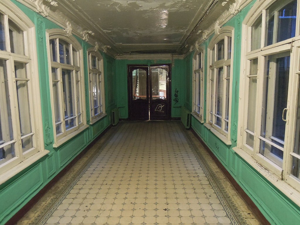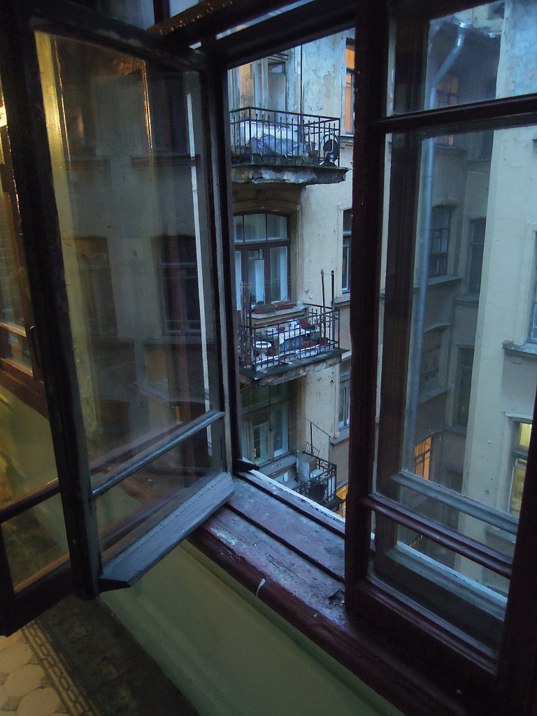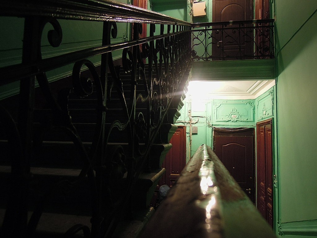 Mit ein bisschen Glück konnten wir in ein ehemals von wohlhabenden Besitzern bewohntes (natürlich hohes, großes) Haus gelangen, das mittlerweile ein wenig verfallen, aber immer noch sehr beeindruckend war. Die Wandfarbe war etwa im Türkise-Ton des Juweliers Tiffany gehalten, der Stil passte ebenfalls. Eine Mischung aus altem Schick und fälliger Aufbesserung vermischten sich zu einem einzigartigen Erlebnis, besonders in den nachträglich angebrachten Übergängen über den Innenhof, zur gegenüberliegenden Seite des Hauses, in der 2. sowie 4. Russischen Etage. Diese waren ihrer Zeit auch ein Trick gewesen, um die (Miet-) Preise in die Höhe zu treiben. Nastja erzählte mir, dass heute nur noch arme Menschen dort wohnen, die eine Wohnung in diesem tollen Haus geerbt hatten. Blicke durch die Fenster aus dem Innenhof in die Wohnungen ließen darauf schließen, dass sie Recht hat.