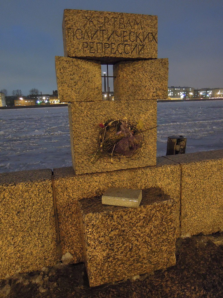 Weiter ging es zur Neva, die durch schneebedecktes, tauendes Eis grade in weiß getaucht ist, vorbei an kleinen Museen und Cafés zu einem Punkt, an dem eine Art Mahnmal gegen politische Inhaftierungen errichtet ist. Genau auf der gegenüberliegenden Nevaseite befindet sich ein noch aktives Gefängnis für politische Häftlinge, das Gerüchten zu Folge nach unterirdisch mit einem KGB-, heute FSB-Gebäude, verbunden sein soll. Dort, so munkelt man, habe Putin zu seiner Zeit bei der Sowjetischen Staatssicherheit gearbeitet. Immerhin der Ausblick, den die Häftlinge dort auf die Neva haben, ist nicht übel.