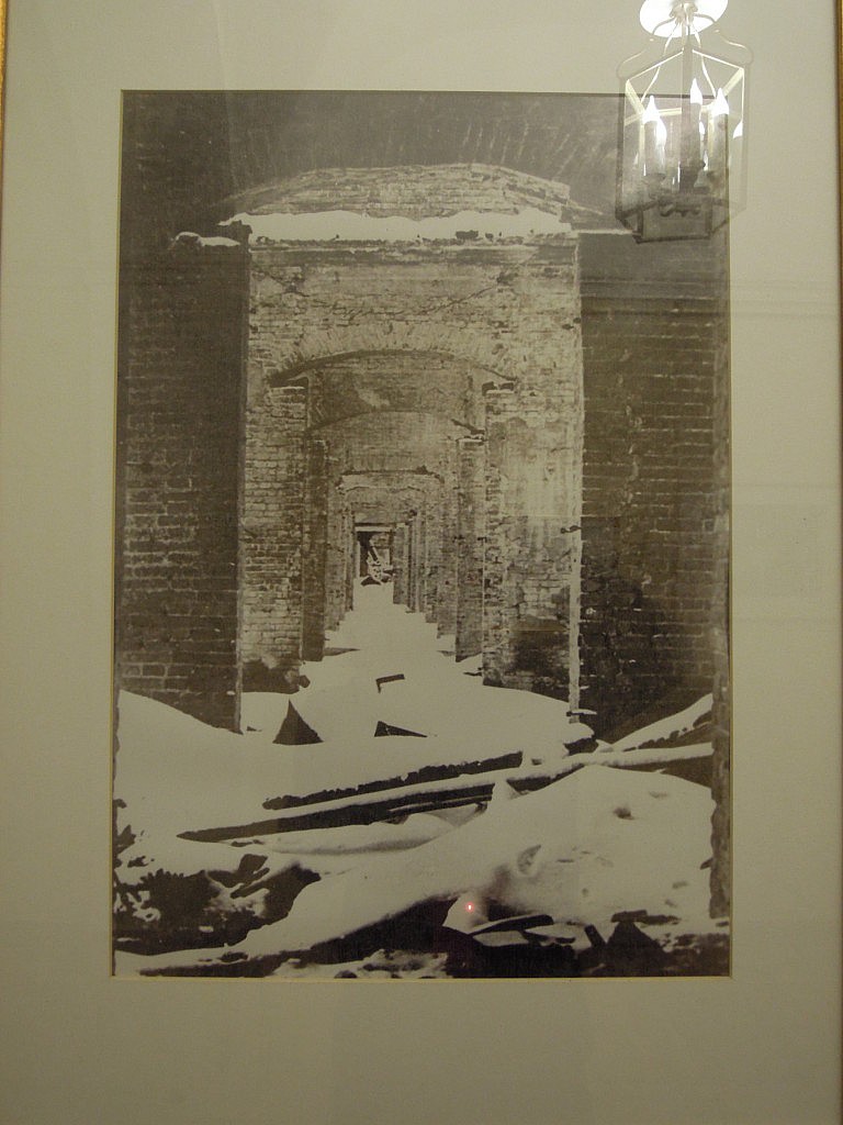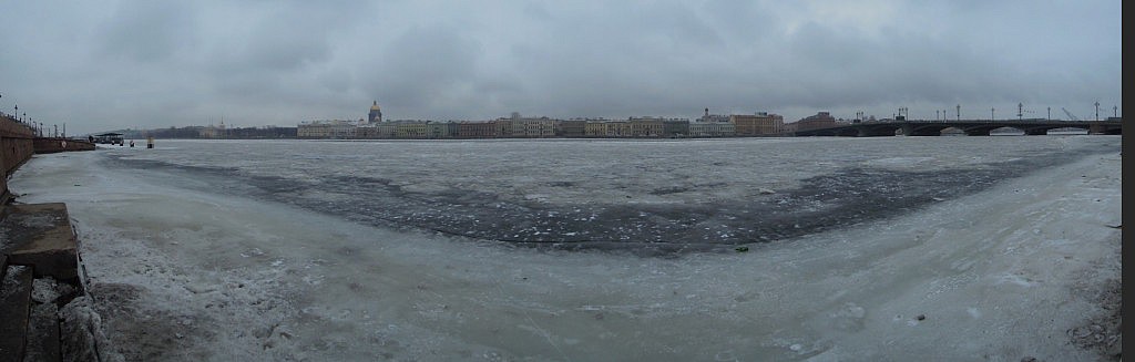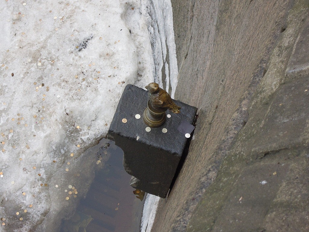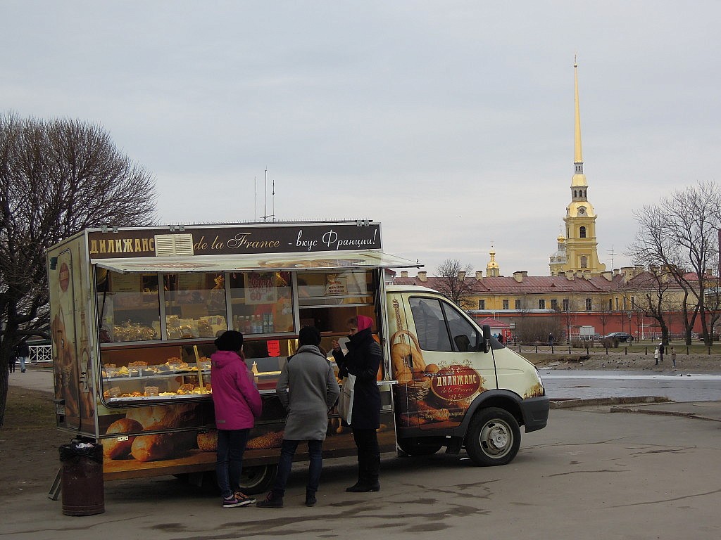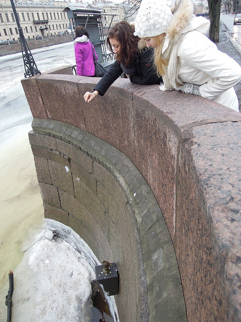 Weiter ging es zur Neva, die durch schneebedecktes, tauendes Eis grade in weiß getaucht ist, vorbei an kleinen Museen und Cafés zu einem Punkt, an dem eine Art Mahnmal gegen politische Inhaftierungen errichtet ist. Genau auf der gegenüberliegenden Nevaseite befindet sich ein noch aktives Gefängnis für politische Häftlinge, das Gerüchten zu Folge nach unterirdisch mit einem KGB-, heute FSB-Gebäude, verbunden sein soll. Dort, so munkelt man, habe Putin zu seiner Zeit bei der Sowjetischen Staatssicherheit gearbeitet. Immerhin der Ausblick, den die Häftlinge dort auf die Neva haben, ist nicht übel.