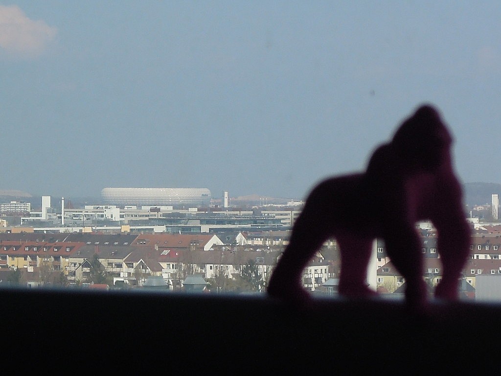 Pinker Schimpanse vor Allianz Arena – die Meisterschaft des FCB konnte er nichtmehr verhindern.