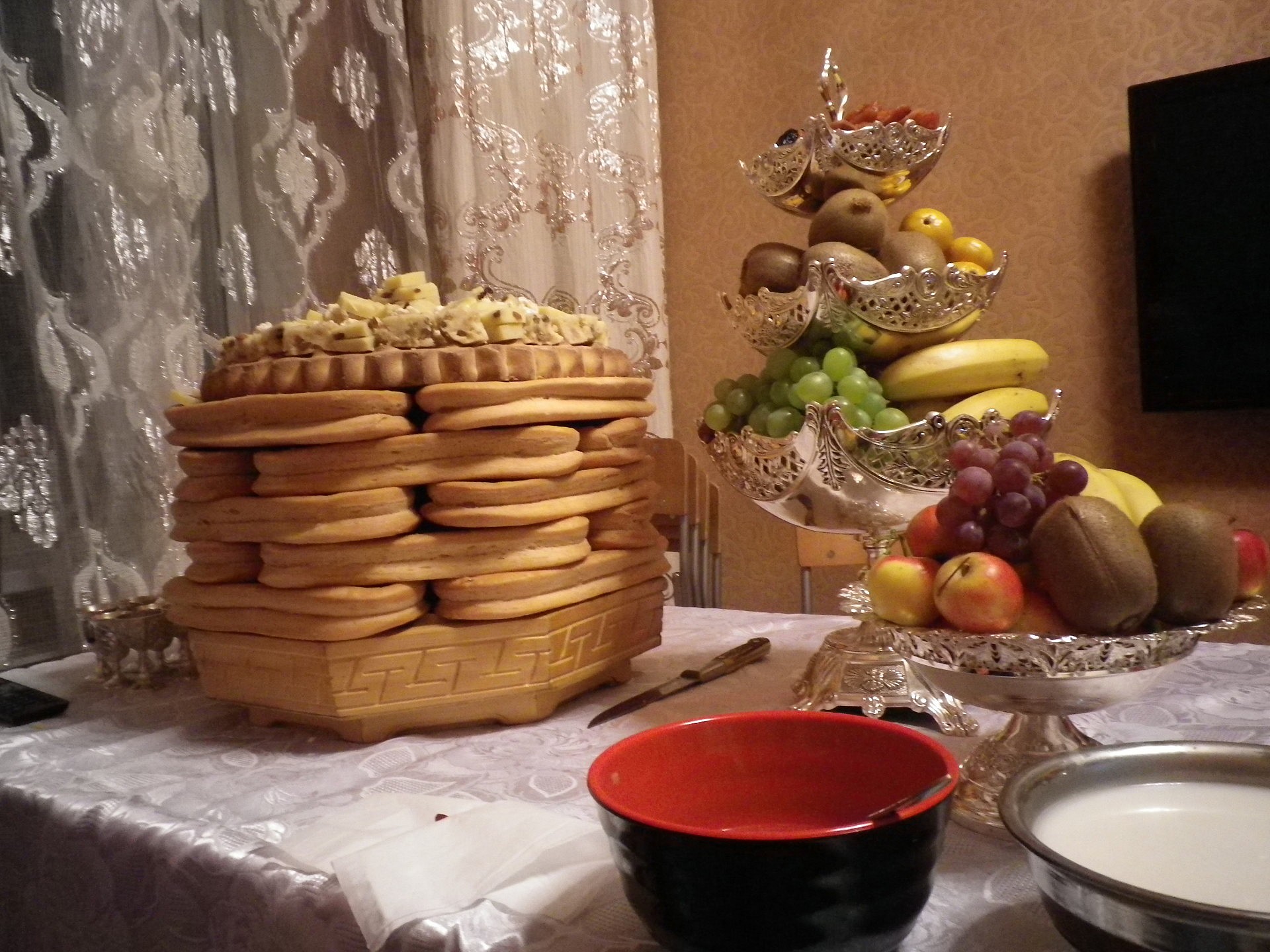 Der Donnerstag stand ganz im Zeichen der Essensvorbereitung: Schinken wurden zerlegt, Obst gewaschen, Fleisch tiefgefroren und Gemuese geputzt. Die ganze Familie, Schwestern, Nichten, Neffen und andere Verwandte und Bekannte des Brautpaares, war zugegen und half mit. Von Verwandten wurde Geschirr und ein Hochzeitsauto geliehen. Der Braeutigam verliess am Vorabend der Hochzeit in traditioneller Gewandung mit einer Handvoll Maenner seine Wohnung, um seine zukuenftige Frau abzuholen. In der Wohnung war mittlerweile das Wohnzimmer leergeraeumt worden und zwei Tische mit Essen beladen worden. Hier wuerden die Feierlichkeiten am naechsten Morgen starten.