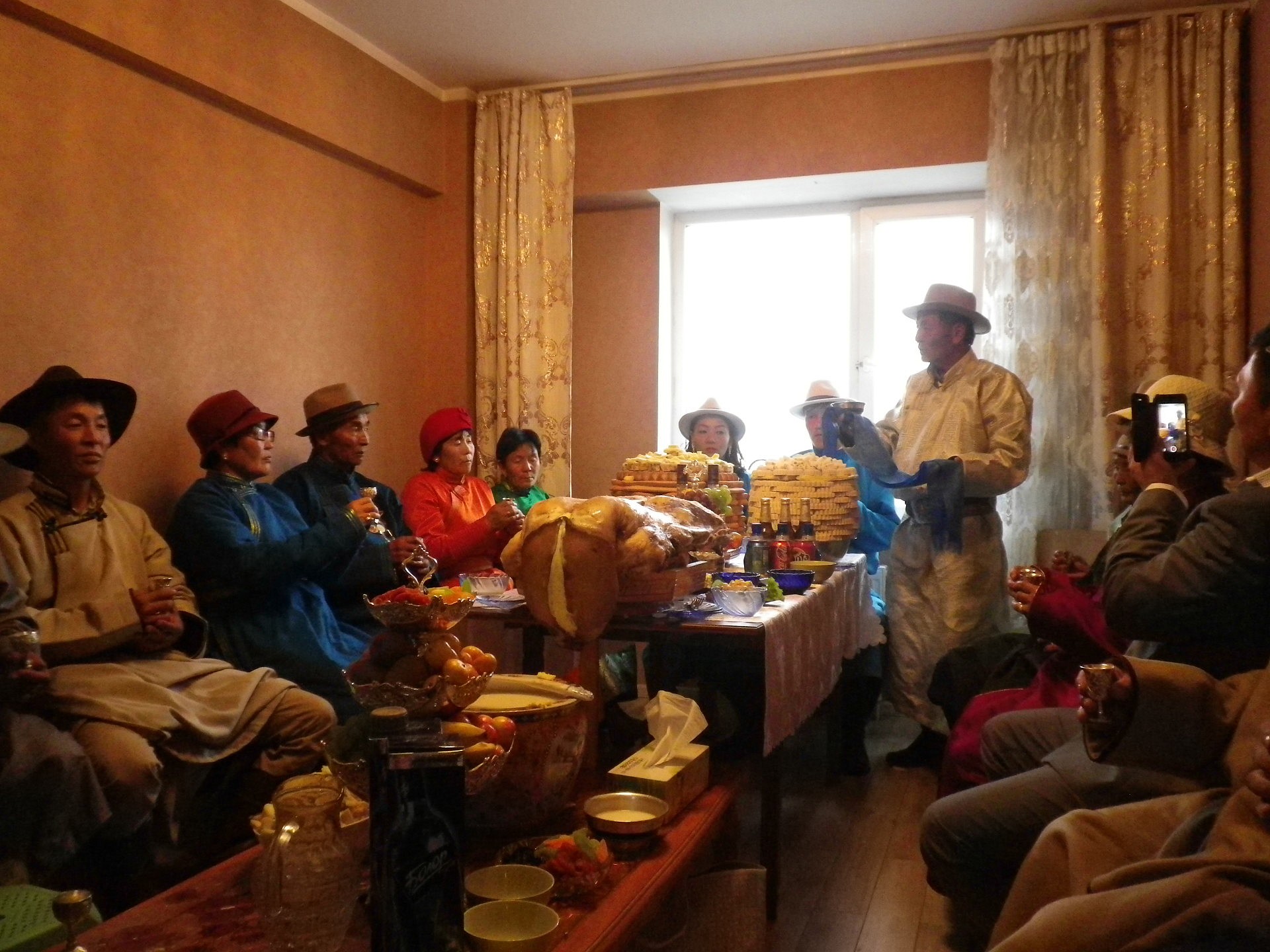 Der Freitag begann fuer mich um acht Uhr, und ich glaube, ich bin von allen Beteiligten am spaetesten aufgestanden. Gegen halb zehn betrat die Hochzeitsgesellschaft die Wohnung: Das Brautpaar samt kleinem Sohn in Deel und mit Hut. Dazu die Handvoll Maenner vom gestrigen Abend sowie Verwandschaft der Braut, alle traditionell gekleidet. Als erstes wurden die Riechflaeschchen getauscht. Dann wurden Getraenke gereicht: Airag (vergorene Stutenmilch) und Stutenmilchvodka. Es wurde auf das Brautpaar gesungen und schliesslich eine kleine Zeremonie abgehalten (ich tippe mal auf Segenswunsch), bei der das Brautpaar aus einer Schale Stutenmilchvodka trank. Schliess wurde noch der Schoepfloeffel mit einem blauen Band umwickelt (ich tippe auch hier wieder auf Segenswunsch) und die Braut hat damit Milchtee gekocht und den Gaesten gereicht. Damit war der offizielle Teil zu Ende, und das Essen und Trinken begann. Immer wieder stimmten die Aelteren ein Lied an, in das alle Beteiligten einfielen, ein paar Worte wurden zum Brautpaar gesprochen. Das hatte sich mittlerweile auch umgezogen und war mit der Bewirtung der Gaeste beschaeftigt.