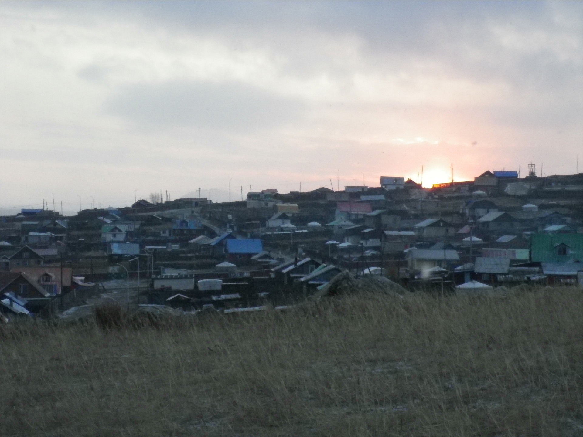 Obwohl hier an die 80.000 Menschen leben, empfinde ich Erdenet als recht klein. Das mag mit der Stadtstruktur zusammenhaengen: Das eigentliche „Zentrum“ Erdenets, mit Supermaerkten, Markthallen, vielen Geschaeften, oeffentlichen Plaetzen etc. ist ueberschaubar und es gibt auch nicht viele hochaufragende Haeuser. Statt in die Hoehe erstreckt sich Erdenet in die Breite: Die Huegel ausserhalb des asphaltierten Zentrums sind von tausenden kleinen Hausern, Kleinsthaeuschen und Jurten besiedelt. Um den Kern der Stadt mit Schulen, Verwaltungsgebaeuden, oeffentlichn Einrichtungen etc. herum erstreckt sich ein riesiger Teppich aus „Jurtenvierteln“. Dort sind die Strassen ungeteert, es gibt Elektrizitaet, aber kein fliessend Wasser. Kleine Busse und private Taxen fahren dort hinein, um die Menschen von der Arbeit nach Hause zu bringen oder andersherum.