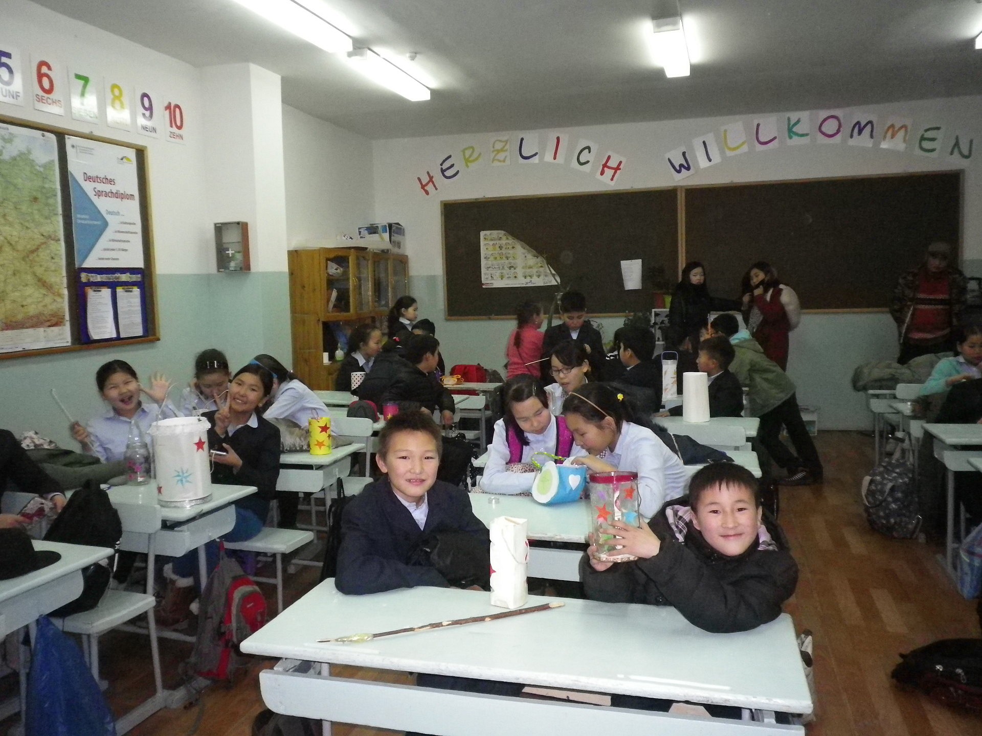 Am naechsten Tag empfingen mich die Kinder schon morgens ganz aufgekratzt und praesentierten mir ihre selbstgemachten Laternen. Und diese waren mit so viel Liebe und Ideenreichtum gefertigt, dass ich nur staunen konnte und ein wenig neidisch wurde, mir keine gebastelt zu haben (ich gebe zu, ich wusste nicht genau, wie ich eine fertigen sollte..). Die Laternen bestanden aus Marmeladen- oder Babynahrungsglaeschen, Plastikflaschen, einfach nur viel Papier, dicker Pappe, Transparentpapier, Drahtkoerbchen etc. Sie waren bunt bemalt, Formen war in die Pappe geschnitten, Sterne waren aufgeklebt. Auf einigen prangten Glitzersticker, die „Deutsch“ oder „Laterne“ bildeten, Spitzenborten waren angeklebt, 3D-Aufkleber, Draht, Transparentpapier, Krepp und Stoff waren verwendet worden. Jede der Laternen, die mal klein und rund oder gross und viereckig waren, war ein besonderes Unikat und man konnte sehen, wieviel Gedanken und Arbeit in ihnen steckte. Das Problem der Beleuchtung war vielfach durch echte Kerzen oder Teelichter geloest worden, einige benutzten Taschenlampen oder kleine LED-Lichter. Und das breite Grinsen, das in den Gesichtern der Kinder klebte, kann sich wohl jeder vorstellen.