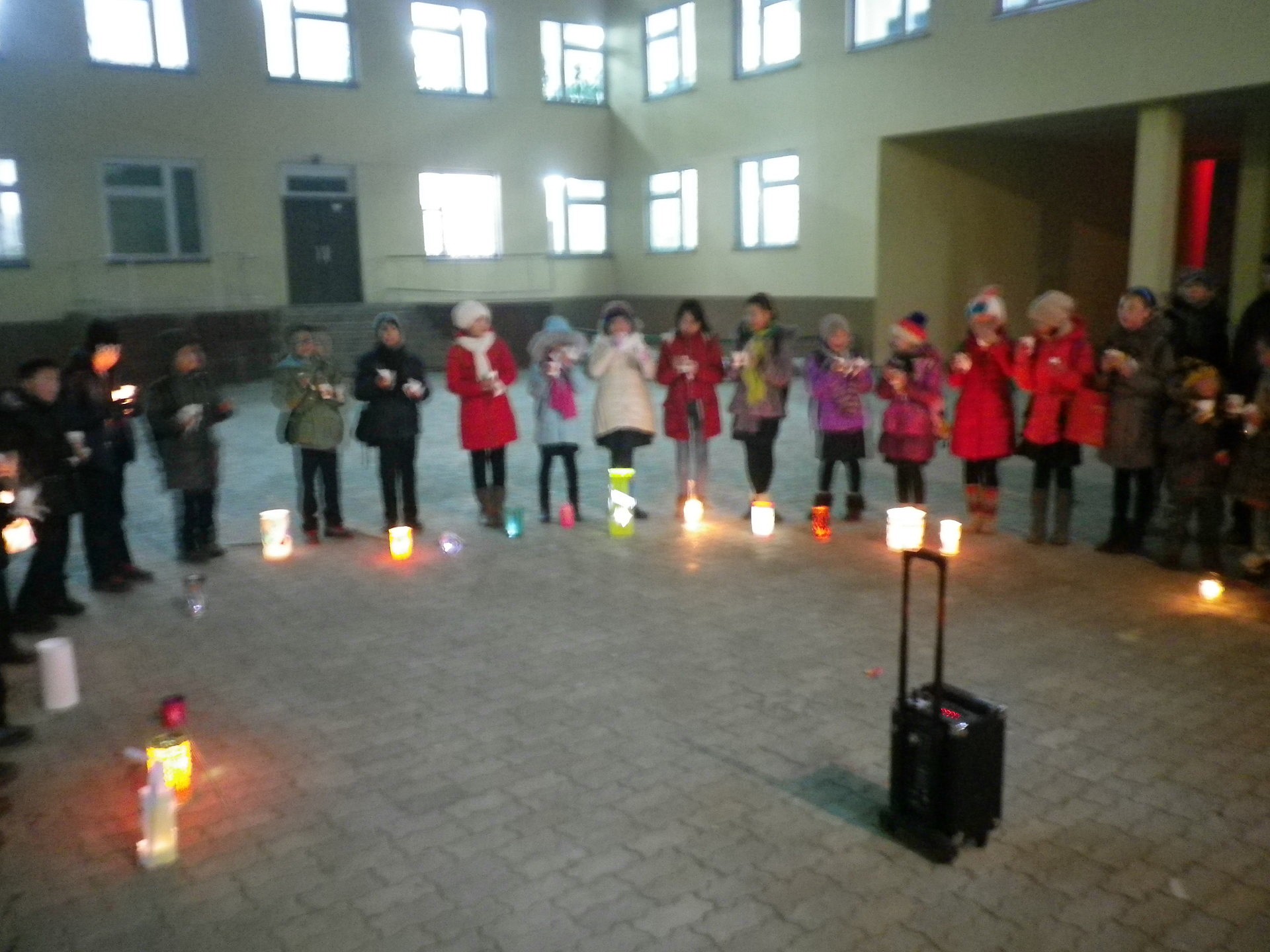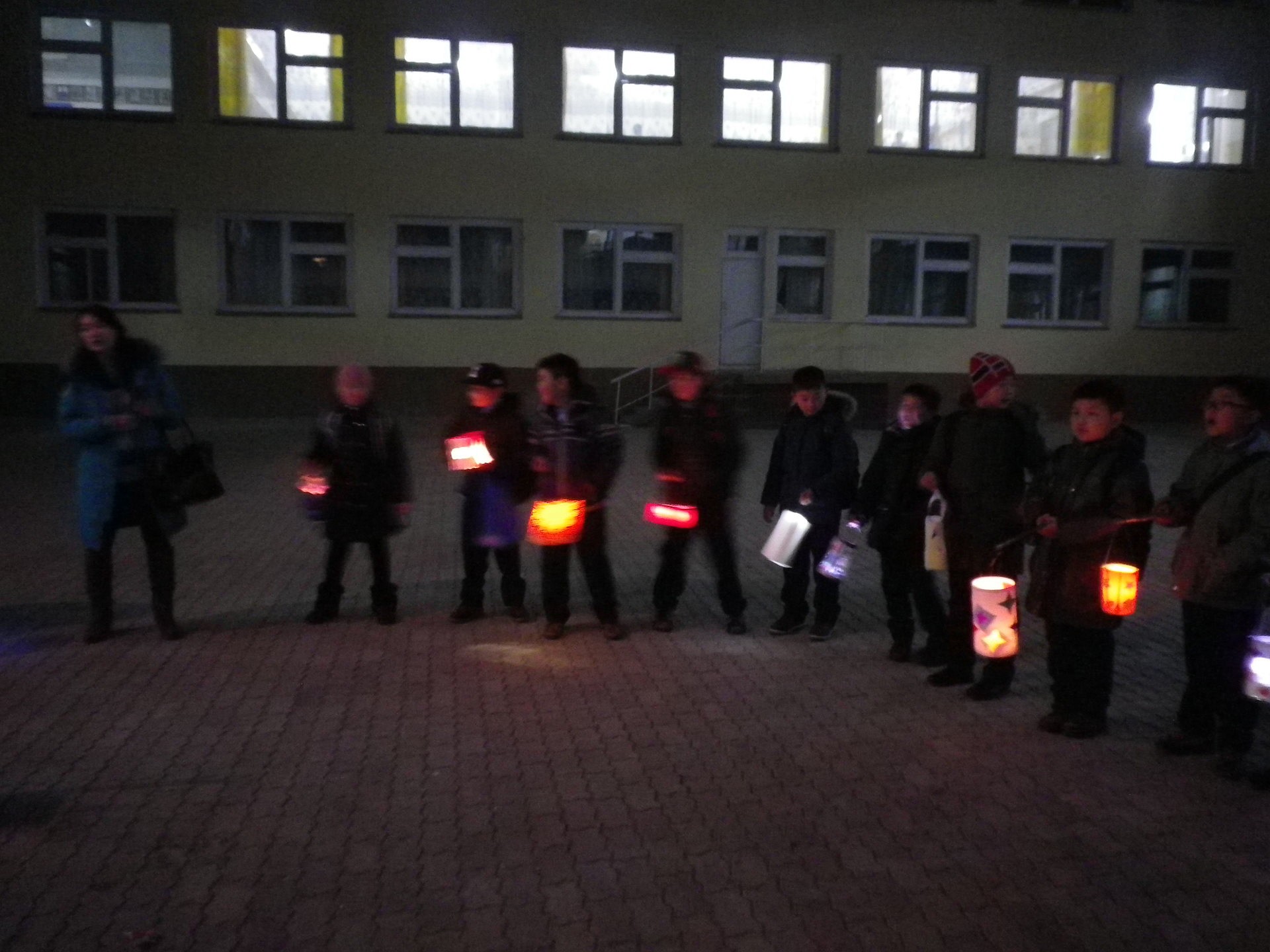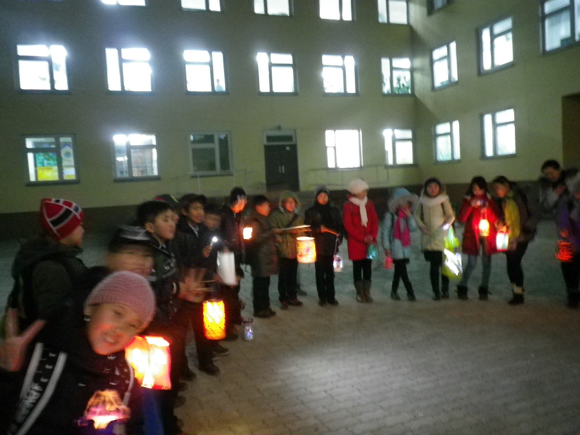 Danach machten wir uns auf den Weg zum „Kulturpalast“, der mitten in Erdenet liegt. Ein Vater schleppte die Musikbox, die Kinder sangen und lachten. Einige aeltere Schueler hatten sich dazu gesellt und halfen bei Problemen wie dem Ausgehen einer Kerze aus. Passanten musterten uns interessiert bis verschreckt und wir alle hatten einen Heidenspass, mit den Laternen durch die Daemmerung zu ziehen. Auf dem Platz angekommen, wurde wieder gesungen, stolze Eltern machten ein paar Fotos. Und zum Abschluss wurde eine Runde „Schnick,Schnack,Schnuck mit Fangen“ gespielt. Nach knapp einer Stunde machten wir uns wieder auf den Weg nach Hause – ein wenig verfroren, aber mit einem begeisterten Laecheln im Gesicht.