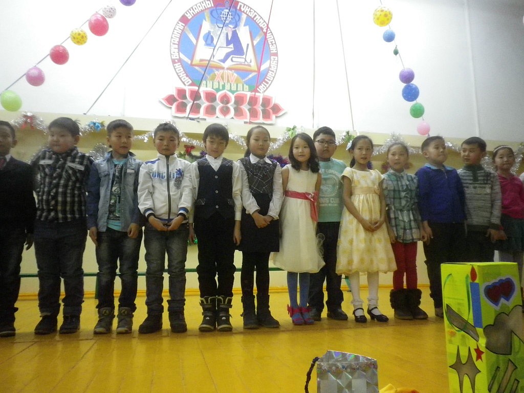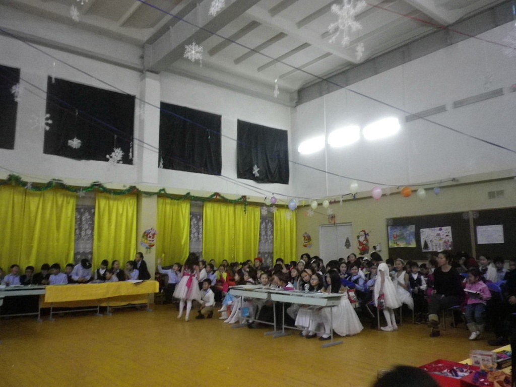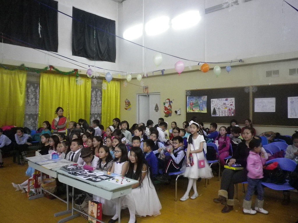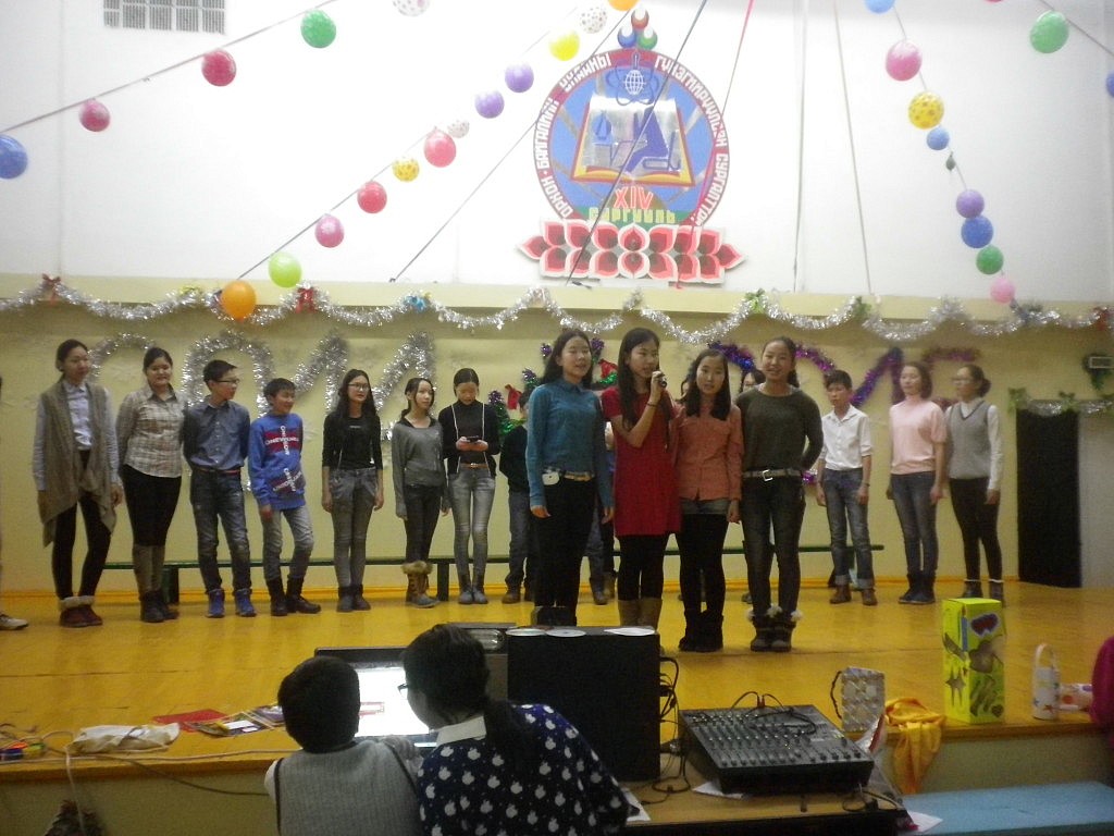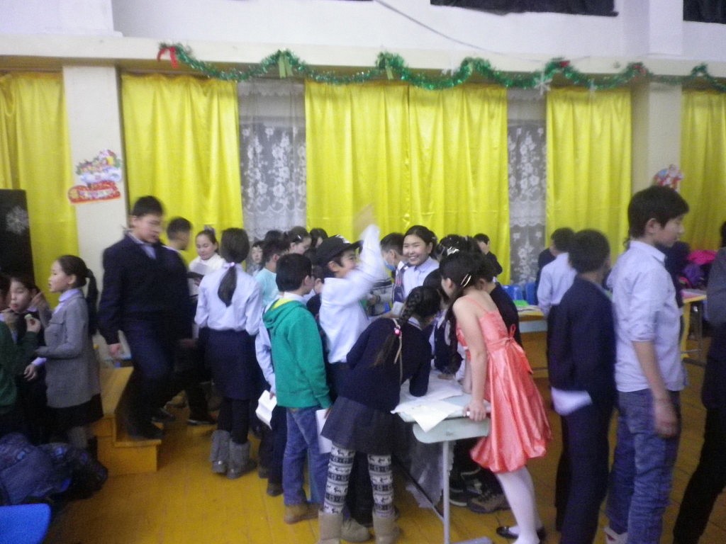 Nach diesem Weihnachtsbasar war ich richtig in Festtagslaune und stürzte mich voller neuer Energie in die Planung unserer eigenen Weihnachtsfeier in Erdenet, die ich vorher ein wenig vernachlässigt hatte. Doch ganz so einfach wurde es nicht, denn die Klassen waren alle damit beschäftigt, sich auf die Neu-Jahrs-Feiern, die hier in der Mongolei fast den gleichen Stellenwert wie bei uns Weihnachtsfeiern besitzen, vorzubereiten und es gab keine Zeit und keinen Ort, meine Projetidee zu verwirklichen. Schließlich, nachdem ich schon ein wenig befürchtet hatte, die Weihnachtsfeier ausfallen zu lassen oder zumindest deutlich verkleinern zu müssen, erfuhr ich am Montag, dass für Donnerstagabend, den 25.12., die Aula der Schule für unsere Weihnachtsfeier frei sei. Was mich am Anfang meines Freiwilligendienstes noch in Schockstarre versetzt hätte, ließ mich jetzt, nach knapp 4 Monaten, nicht mit der Wimper zucken: 3,5 Tage, um eine Feier in der Mongolei vorzubereiten – das ist ja massig Zeit. Und so übte ich fröhlich den Rest der verbleibenden Woche mit den Kindern die Weihnachtslieder und stellte ein kleines Programm auf, was wir so alles machen könnten. Heraus kam ein gemischtes Programm mit Gesang und Theater, zwischendurch eine Pause, in der die Kinder an kleinen Ständen Süßigkeiten verkaufen und die Basteleien des Weihnachtsbasars in der Schule Nr. 1 ausstellen können – also ein ähnliches Programm wie vor knapp 2 Wochen in UB. Was leider nicht klappte, war das Aufführen eines Krippenspiels, das ich eigentlich mit der 9. Klasse geplant hatte. Es tut mir jetzt noch sehr Leid, dass ich mich da nicht genug hintergeklemmt habe. Aber vielleicht gibt es ja auch noch eine andere Gelegenheit, Theater zu spielen.