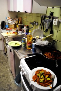 Zu meinem ersten Kochversuch, von dem man links Bilder aus noch glücklichen Minuten sieht: der Teller rechts unten in der Ecke…er lag 20s später genau anders rum auf dem Boden. Und die Nudelns sehen nur so aus, als wären sie lecker gewesen. Aber ich denk mir: Learning by Doing! Und die Zucchini waren echt gut 🙂