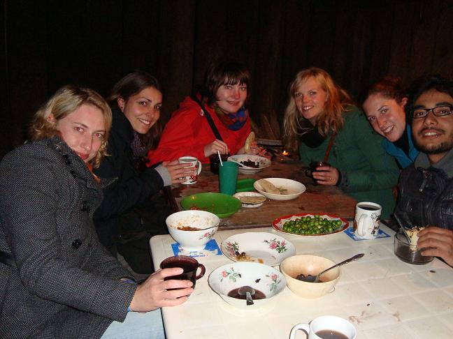 Auf dem Tisch stehen noch die Reste der Bohnen, die kleinen grünen Tomaten, der Kaffee… und wie man sieht war es kalt! Aber irgendwie auch gemütlich… auf jeden Fall eine Erfahrung der etwas anderen Art!