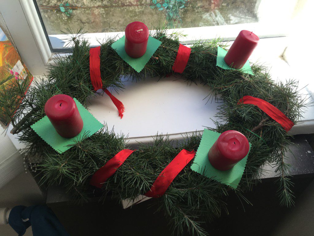 Außerdem verarbeite ich endlich die Zweige, die mir der Hausmeister freundlicherweise für Kränze zurechtgeschnitten hat. Klasse 5 ist zuerst zappelig wie immer, es macht auch nicht so viel Spaß weil ich vieles selbst machen muss. Aber plötzlich ist er fertig, die Kinder drängen sich alle um mein Pult herum. Die Weihnachtsdeko, die sie kennen ist eher bunt, laut und aus Plastik. Sie sind gespannt. Ich lasse eines die 1. Kerze anzünden und mit einem Mal sind sie ganz still. Ich summe spontanen ein Weihnachtslied, das sie kennen. Und auf einmal, wie die Wanzen – Zauber der deutschen Weihnachtsbesinnlichkeit – gebannt hängen sie mir an den Lippen.
