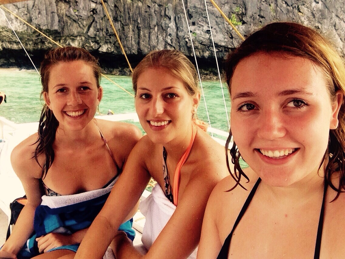 Island-Hopping auf Palawan. Mit dem Boot fährt man einen Tag lang von Insel zu Insel, schnorchelt, erklimmtt „verfluchte Häuser“ und genießt den frischen Fisch, der auf dem Boot zubereitet wird. (von links nach rechts: Erin, Natascha und ich)