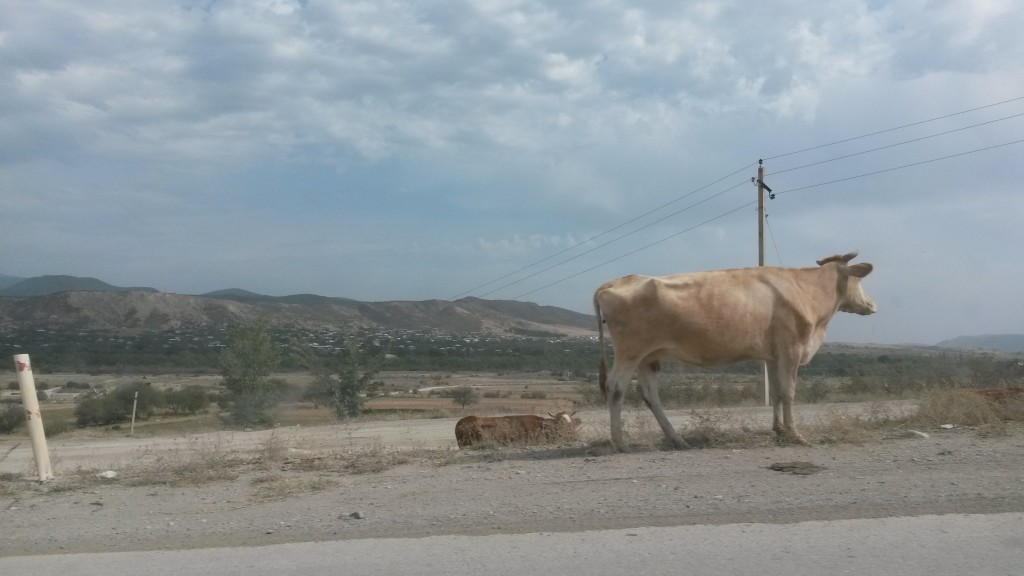 Am nächsten Tag fand ein „Science-Picknick“ im Vake Park statt, wo der DAAD sich ein Zelt mit dem Auswärtigen Amt teilte. Dort war ich jedoch nicht besonders lange und habe nur bei der Auswertung eines Quiz‘ des Auswärtigen Amtes geholfen. Danach bin ich mit meiner Kollegin Tamu und der DAAD-Sprachassistentin Julia zu einer Taxisammelstelle gefahren, von wo aus man Taxis in Richtung Osten nehmen kann und sich, wie bei einer Mitfahrgelegenheit, Leute sucht, die das gleiche Ziel haben. Tamu half uns, einen vertrauenswürdigen Taxifahrer zu finden und einen fairen Preis zu vereinbaren (25 Lari bis Tsinandali, ca. 9 Euro zu zweit). In Tsinandali gibt es ein schönes Weingut, das frühere Anwesen der Chavchavadzes, einem georgischen Fürstengeschlecht. Dieses wollten wir besichtigen und uns auch den Park außenherum ansehen. Zunächst standen uns aber 1 1/2 Stunden Fahrt durch die Berge bevor. Zwischen Julia und mir saß ein junger Georgier, der seine Großeltern in Telavi, der größeren Stadt in der Nähe von Tsinandali, besuchen wollte, und mich schüchtern fragte, woher wir kämen. Viel mehr wurde auf der Fahrt nicht gesprochen, die schöne Aussicht konnte man jedoch auch am besten schweigend genießen. Es ging durch Berg und Tal, unregelmäßige Serpentinen hoch und runter, bis es in den Ohren knackte. Der höchste Punkt war etwas mehr als 1000m. Wir ließen Straßenverkäufer, Tankstellen und Werkstätten hinter uns und fuhren an Menschen vorbei, die einsam am Straßenrand saßen, an freilaufenden Kühen und verfallenen Häusern.