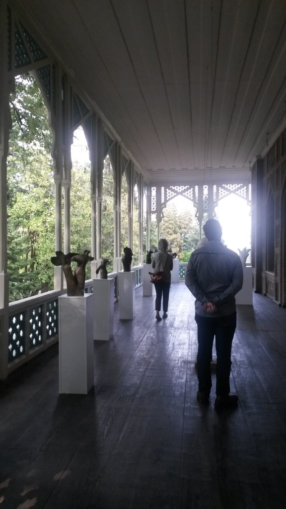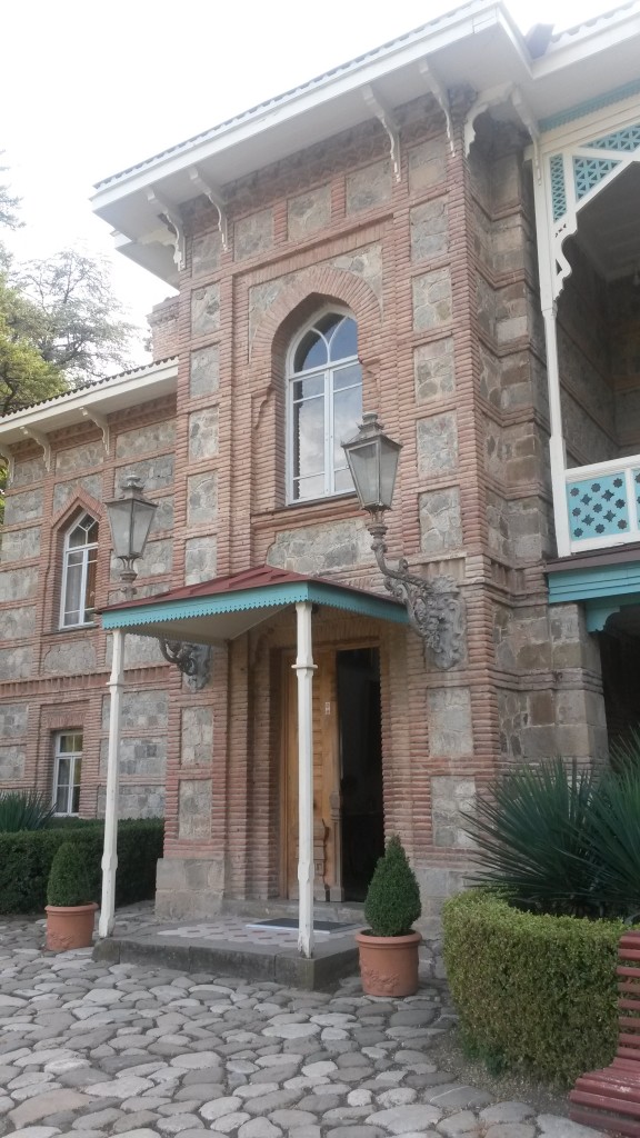 Endlich kamen wir in Tsinandali an und konnten das Anwesen besichtigen. Es gab Führungen auf Englisch durch die oberen Räume des Gebäudes, in denen man die Möbelstücke, Geschirr und Kleidung der Chavchavadzes angucken konnte. Die Führung war jedoch ziemlich schnell vorbei und ich fand es schade, dass man nicht noch einmal allein durch die Räume laufen konnte, da ich mir gerne die zahlreichen Fotos angeguckt hätte. Fotos finde ich immer besonders spannend, da sie einen Moment von damals aufgefangen haben und man sich etwas in diese Zeit versetzen kann. Auf dem großen Balkon konnte man sich eine Ausstellung französischer Künstler ansehen, die aus Skulpturen und Gemälden bestand. Im Eintrittspreis von 7 Lari pro Person war ebenso ein Glas Wein inbegriffen, das wir natürlich gerne annahmen. Es gab georgischen und europäischen Weißwein, wobei mir der georgische etwas zu trocken ist. Der Park war auch sehr schön angelegt mit ein paar Wegen, kleinem Buschlabyrinth und Blumenbeeten.