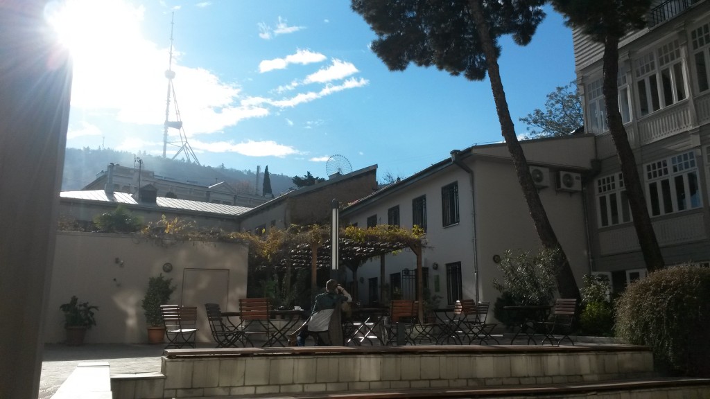 Im Büro angekommen, winke ich in die Runde und setze mich an meinen großen Tisch, auf dem meist alles erstmal abgestellt wird, weil es der größte Tisch ist, der auch noch direkt am Eingang steht. Ich habe einen eigenen Laptop und einen ganz persönlichen Papierwolf, der sich oft schon mal überfrisst an den gut gemeinten Mengen an Papier, die wir ihm zu fressen geben. Der IC-Leiter und die beiden georgischen Mitarbeiterinnen sind meist schon in ein Gespräch über gestrige Vorkommnisse, das Büroinventar oder die Restaurantwahl für den Besuch der Kommission vertieft. Kurz zu meinen KollegInnen: Nino ist eher ruhig und bedacht, kann aber auch sehr viel reden – ihr Handy klingelt im Minutentakt – und lacht oft herzhaft. Sie erzählt gerne Anekdoten von früheren Praktikanten und Freiwilligen und scheint sich jedes Detail und jede witzige Situation zu merken. Tamu redet und lacht ebenso gerne, jedoch um einiges lauter 😀 Sie sorgt allgemein im Büro immer für gute Stimmung und hat uns oft bei Ausflügen begleitet oder uns Taxis organisiert. Der bayrische IC-Leiter und der Lektor sind zwei, die sich gefunden haben und gerne ihre Witze unter Männern austauschen. Auch zwischen dem Lektor und Tamu fliegen die frechen, aber lieb gemeinten Sprüche nur so hin und her und bringen uns alle oft zum Lachen. Die Atmosphäre ist demnach mehr als familiär und wirklich perfekt, um entspannt zu arbeiten. Selbst, wenn viel zu tun ist, wird Hand in Hand gearbeitet und einander geholfen, bis alles erledigt ist. Ein Pläuschen im schönen Innenhof des Café Goethe mit Blick auf das Restaurant und das Riesenrad am Mtatsminda („Heiliger Berg“) ist auch bei viel Stress immer drin.