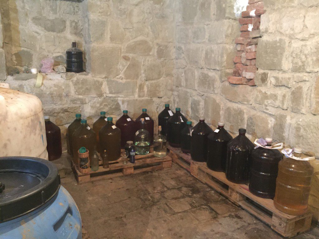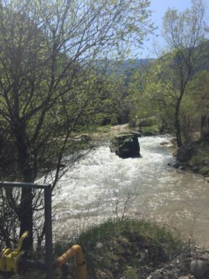 Danach folgten wir einem Weg, der uns auf eine Brücke über einen Fluss brachte. Der Mangel an Infrastruktur wurde durch einen Geländewagenfahrer bewiesen, der genötigt war mit seinem Auto durch den Fluss zu fahren, weil…Ja, warum eigentlich? Gibt es tatsächlich keinen anderen Weg in die Berge? Wollte er sein Auto waschen? War es pure Faulheit? Oder Lust? Man weiß es nicht. Das Auto war auf jeden Fall im Fluss stecken geblieben. Doch unsere Hilfe wollte der Fahrer nicht annehmen. Supercool winkte er ab und so gingen wir weiter. Nach ein paar Metern kamen wir an ein sehr vielversprechendes Schild: Wine Cellar.