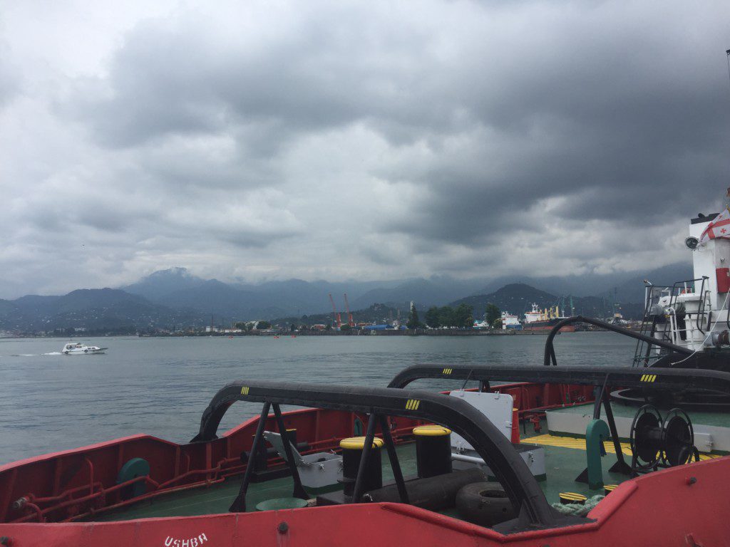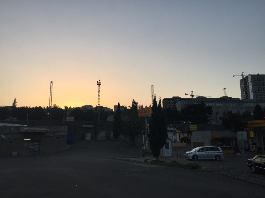 Um 5 Uhr morgens ist die schönste Zeit draußen zu sein. Sich fragend, ob nun eher Tag oder Nacht ist. Sonne, Mond und Sterne teilen sich den violetten Himmel. Die sonst so volle Stadt ist wie leergefegt. Die Zeit steht still. Ich kann durchatmen. Hin und wieder hört man ein Auto vorbeifahren. Jemand fegt den Bürgersteig. Ein, zwei Frühaufsteher erledigen die Einkäufe bevor die tagtägliche Hitze hereinbricht. Man spürt sie jetzt schon. Einer der Gründe für mich ans Meer zu fahren. Alleine die Küste hoch: von Batumi, der südlichsten Großstadt Georgiens, Bade- und Partyresort, 13 km von der türkischen Grenze entfernt, nach Poti, das Nahe des immer noch von russischen Truppen besetzten Abchasien liegt.
