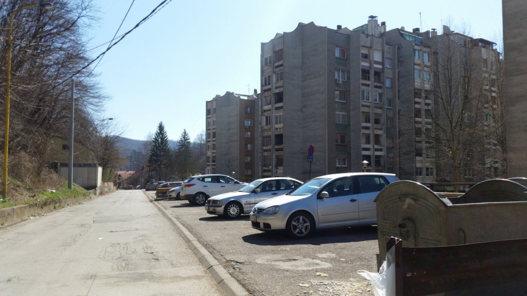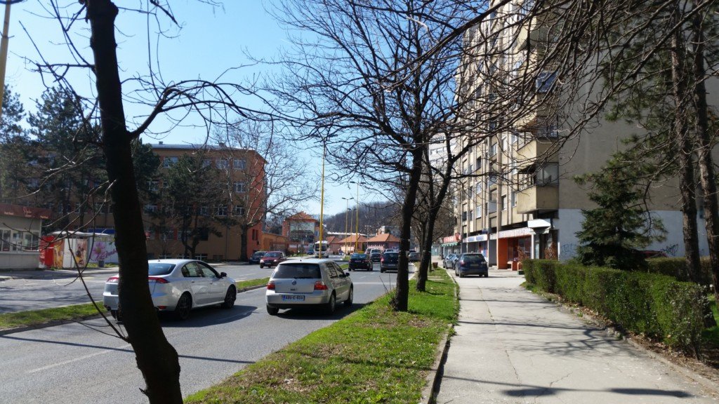 Der Bulevar vor der Schule — einer von zwei Hauptverkehrsachsen, die Tuzla auf beiden Seiten des Tals einrahmen